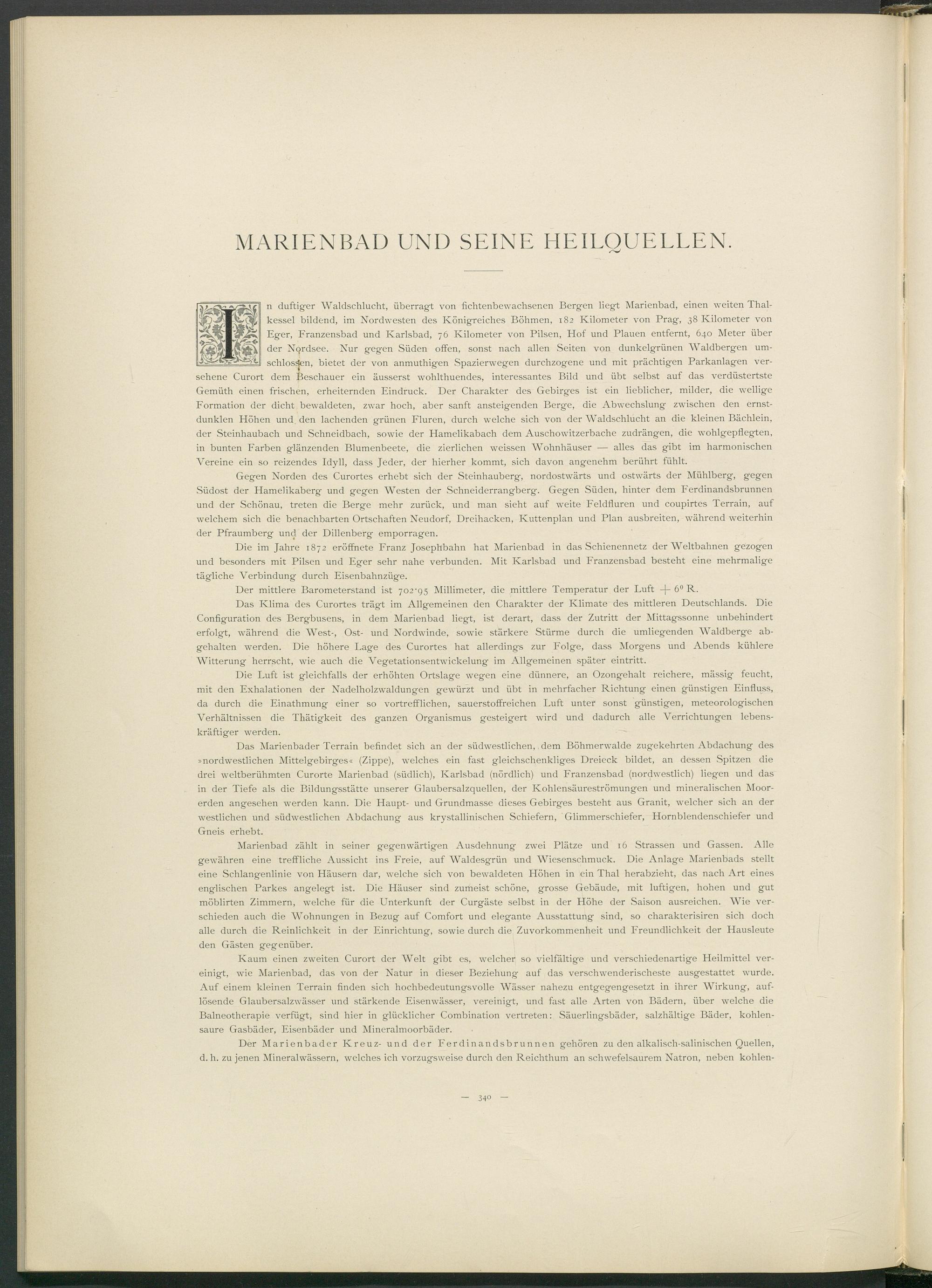 n duftiger Waldschlucht, überragt von fichtenbewachsenen Bergen liegt Marienbad, einen weiten Thalkessel bildend, im Nordwesten des Königreiches Böhmen, 182 Kilometer von Prag, 38 Kilometer von Eger, Franzensbad und Karlsbad, 76 Kilometer von Pilsen, Hof und Plauen entfernt, 640 Meter über der Nordsee. Nur gegen Süden offen, sonst nach allen Seiten von dunkelgrünen Waldbergen umschlossen, bietet der von anmuthigen Spazierwegen durchzogene und mit prächtigen Parkanlagen versehene Curort dem Beschauer ein äusserst wohlthuendes, interessantes Bild und übt selbst auf das verdüstertste Gemüth einen frischen, erheiternden Eindruck. Der Charakter des Gebirges ist ein lieblicher, milder, die wellige Formation der dicht bewaldeten, zwar hoch, aber sanft ansteigenden Berge, die Abwechslung zwischen den ernstdunklen Höhen und den lachenden grünen Fluren, durch welche sich von der Waldschlucht an die kleinen Bächlein, der Steinhaubach und Schneidbach, sowie der Hamelikabach dem Auschowitzerbache zudrängen, die wohlgepflegten, in bunten Farben glänzenden Blumenbeete, die zierlichen weissen Wohnhäuser — alles das gibt im harmonischen Wreine ein so reizendes Idyll, dass Jeder, der hierher kommt, sich davon angenehm berührt fühlt.