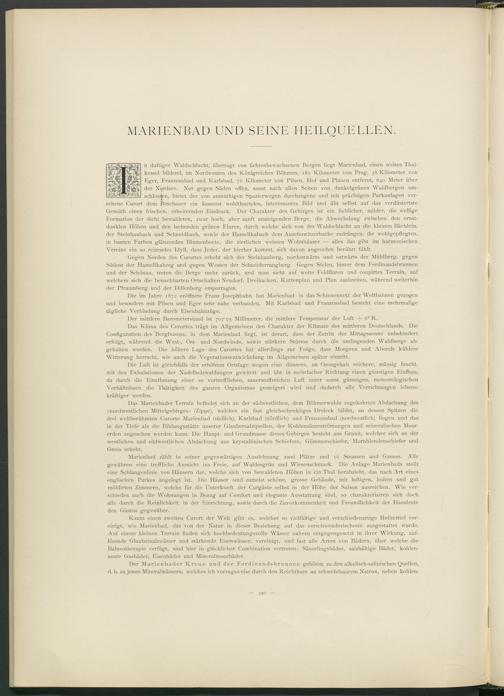 Kaum einen zw-eiten Curort der Welt gibt es, welcher so vielfältige und verschiedenartige Heilmittel vereinigt, wie Marienbad, das von der Natur in dieser Beziehung auf das verschwenderischeste ausgestattet wurde. Auf einem kleinen Terrain finden sich hochbedeutungsvolle Wässer nahezu entgegengesetzt in ihrer Wirkung, auflösende Glaubersalzwässer und stärkende Eisenwässer, vereinigt, und fast alle Arten von Bädern, über welche die Balneotherapie verfügt, sind hier in glücklicher Combination vertreten: Säuerlingsbäder, salzhältige Bäder, kohlensaure Gasbäder, Eisenbäder und Mineralmoorbäder.
