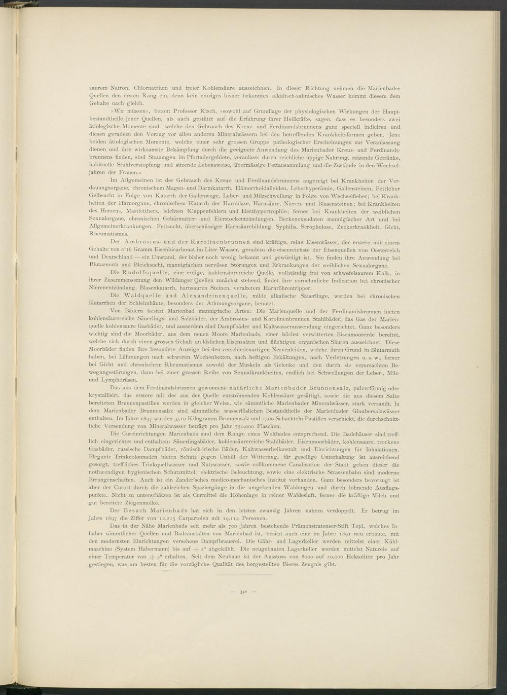»Wir müssen«, betont Professor Kisch, »sowohl auf Grundlage der physiologischen Wirkungen der Haupt- bestandtheile jener Quellen, als auch gestützt auf die Erfahrung ihrer Heilkräfte, sagen, dass es besonders zwei ätiologische Momente sind, welche den Gebrauch des Kreuz- und Ferdinandsbrunnens ganz speciell indiciren und diesen geradezu den Vorzug vor allen anderen Mineralwässern bei den betreffenden Krankheitsformen geben. Jene beiden ätiologischen Momente, welche einer sehr grossen Gruppe pathologischer Erscheinungen zur Veranlassung dienen, und ihre wirksamste Bekämpfung durch die geeignete Anwendung des Marienbader Kreuz- und Ferdinandsbrunnens finden, sind Stauungen im Pfortadergebiete, veranlasst durch reichliche üppige Nahrung, reizende Getränke, habituelle Stuhlverstopfung und sitzende Lebensweise, übermässige Fettansammlung und die Zustände in den Wechseljahren der Frauen.«