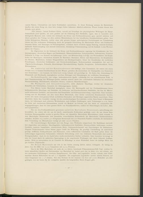 Das aus dem Ferdinandsbrunnen gewonnene natürliche Marienbader Brunnensalz, pulverförmig oder krystallisirt, das erstere mit der aus der Quelle entströmenden Kohlensäure gesättigt, sowie die aus diesem Salze bereiteten Brunnenpastillen w T erden in gleicher Weise, wie sämmtliche Marienbader Mineralwässer, stark versandt. In dem Marienbader Brunnensalze sind sämmtliche wasserlöslichen Bestandtheile der Marienbader Glaubersalzwässer enthalten. Im Jahre 1897 wurden 3510 Kilogramm Brunnensalz und 2500 Schachteln Pastillen verschickt, die durchschnittliche Versendung von Mineralwasser beträgt pro Jahr 750.000 Flaschen.