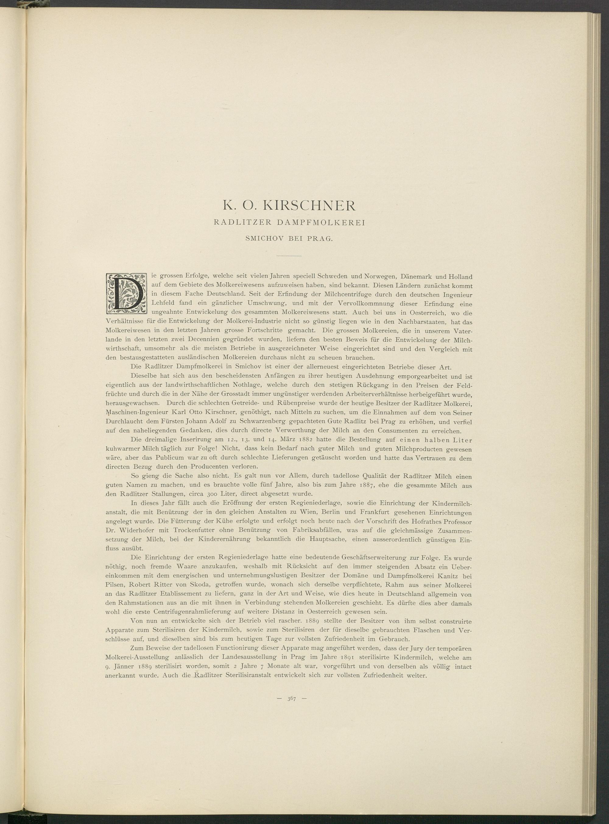 Dieselbe hat sich aus den bescheidensten Anfängen zu ihrer heutigen Ausdehnung emporgearbeitet und ist eigentlich aus der landwirtschaftlichen Nothlage, welche durch den stetigen Rückgang in den Preisen der Feldfrüchte und durch die in der Nähe der Grosstadt immer ungünstiger werdenden Arbeiterverhältnisse herbeig-eführt wurde, herausgewachsen. Durch die schlechten Getreide- und Rübenpreise wurde der heutige Besitzer der Radlitzer Molkerei, Maschinen-Ingenieur Karl Otto Kirschner, genötigt, nach Mitteln zu suchen, um die Einnahmen auf dem von Seiner Durchlaucht dem Fürsten Johann Adolf zu Schwarzenberg gepachteten Gute Radlitz bei Prag zu erhöhen, und verfiel auf den naheliegenden Gedanken, dies durch directe Verwerthung der Milch an den Consumenten zu erreichen.