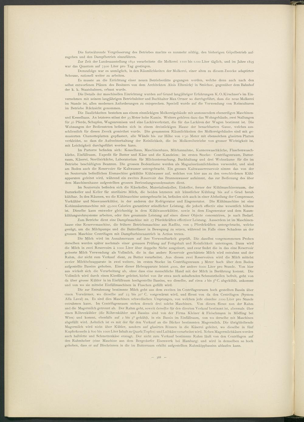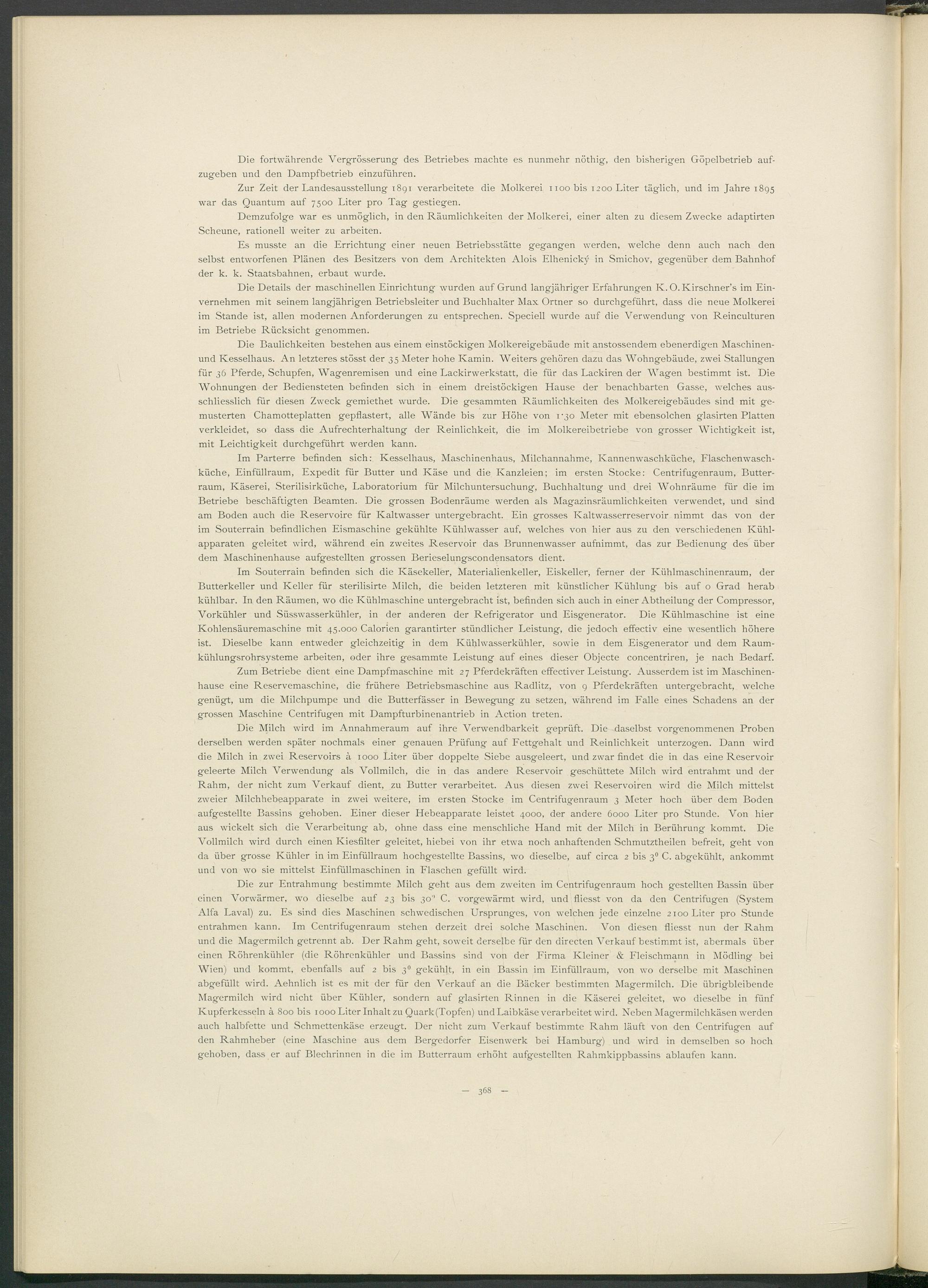 Die Details der maschinellen Einrichtung wurden auf Grund langjähriger Erfahrungen K. O. Kirschner’s im Einvernehmen mit seinem langjährigen Betriebsleiter und Buchhalter Max Ortner so durchgeführt, dass die neue Molkerei im Stande ist, allen modernen Anforderungen zu entsprechen. Speciell wurde auf die Verwendung von Reinculturen im Betriebe Rücksicht genommen.