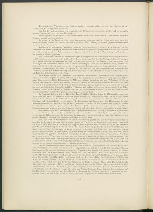 Die Baulichkeiten bestehen aus einem einstöckigen Molkereigebäude mit anstossendem ebenerdigen Maschinen- und Kesselhaus. An letzteres stösst der 35 Meter hohe Kamin. Weiters gehören dazu das Wohngebäude, zwei Stallungen für 36 Pferde, Schupfen, Wagenremisen und eine Lackirwerkstatt, die für das Lackiren der Wagen bestimmt ist. Die Wohnungen der Bediensteten befinden sich in einem dreistöckigen Hause der benachbarten Gasse, welches ausschliesslich für diesen Zweck gemiethet wurde. Die gesammten Räumlichkeiten des Molkereigebäudes sind mit gemusterten Chamotteplatten gepflastert, alle Wände bis zur Höhe von i’30 Meter mit ebensolchen glasirten Platten verkleidet, so dass die Aufrechterhaltung der Reinlichkeit, die im Molkereibetriebe von grosser Wichtigkeit ist, mit Leichtigkeit durchgeführt werden kann.