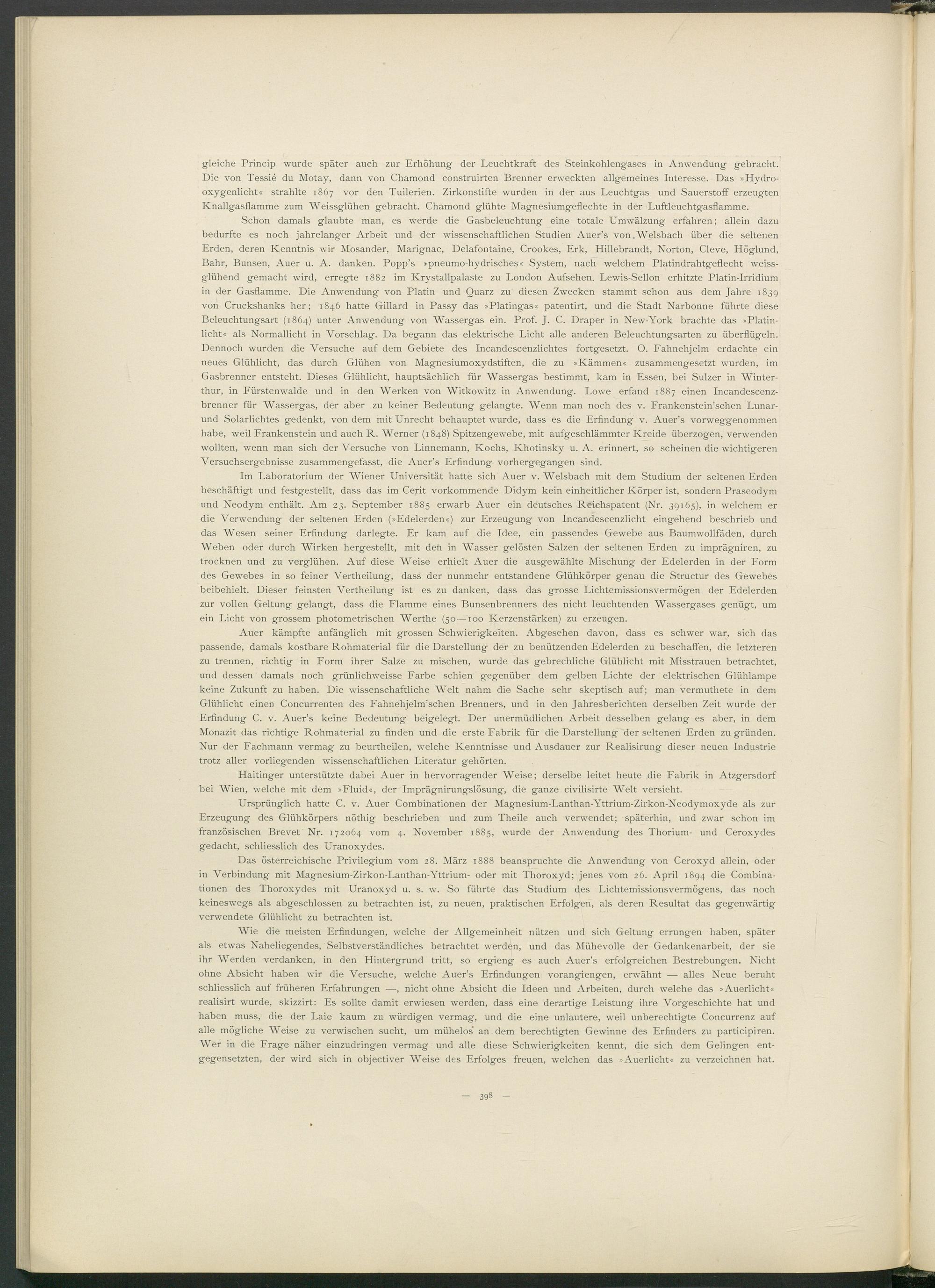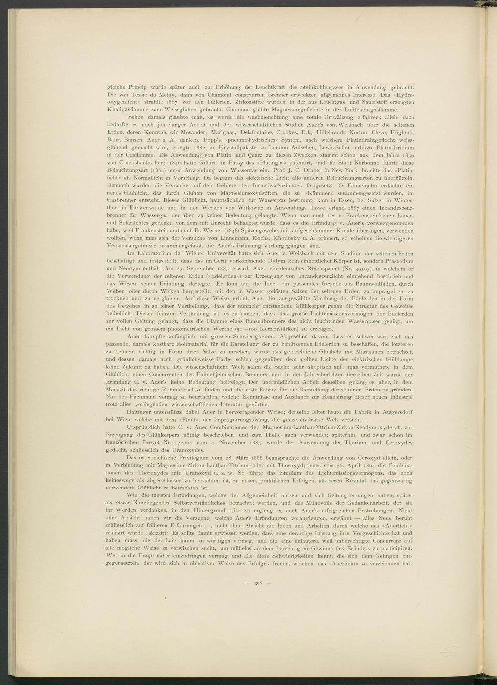 Wie die meisten Erfindungen, welche der Allgemeinheit nützen und sich Geltung errungen haben, später als etwas Naheliegendes, Selbstverständliches betrachtet werden, und das Mühevolle der Gedankenarbeit, der sie ihr Werden verdanken, in den Hintergrund tritt, so ergieng es auch Auer’s erfolgreichen Bestrebungen. Nicht ohne Absicht haben wir die Versuche, welche Auer’s Erfindungen vorangiengen, erwähnt — alles Neue beruht schliesslich auf früheren Erfahrungen —, nicht ohne Absicht die Ideen und Arbeiten, durch welche das »Auerlicht« realisirt wurde, skizzirt: Es sollte damit erwiesen werden, dass eine derartige Leistung ihre Vorgeschichte hat und haben muss, die der Laie kaum zu würdigen vermag, und die eine unlautere, weil unberechtigte Concurrenz auf alle mögliche Weise zu verwischen sucht, um mühelos" an dem berechtigten Gewinne des Erfinders zu participiren. Wer in die Frage näher einzudringen vermag und alle diese Schwierigkeiten kennt, die sich dem Gelingen entgegensetzten, der wird sich in objectiver Weise des Erfolges freuen, welchen das »Auerlicht« zu verzeichnen hat.