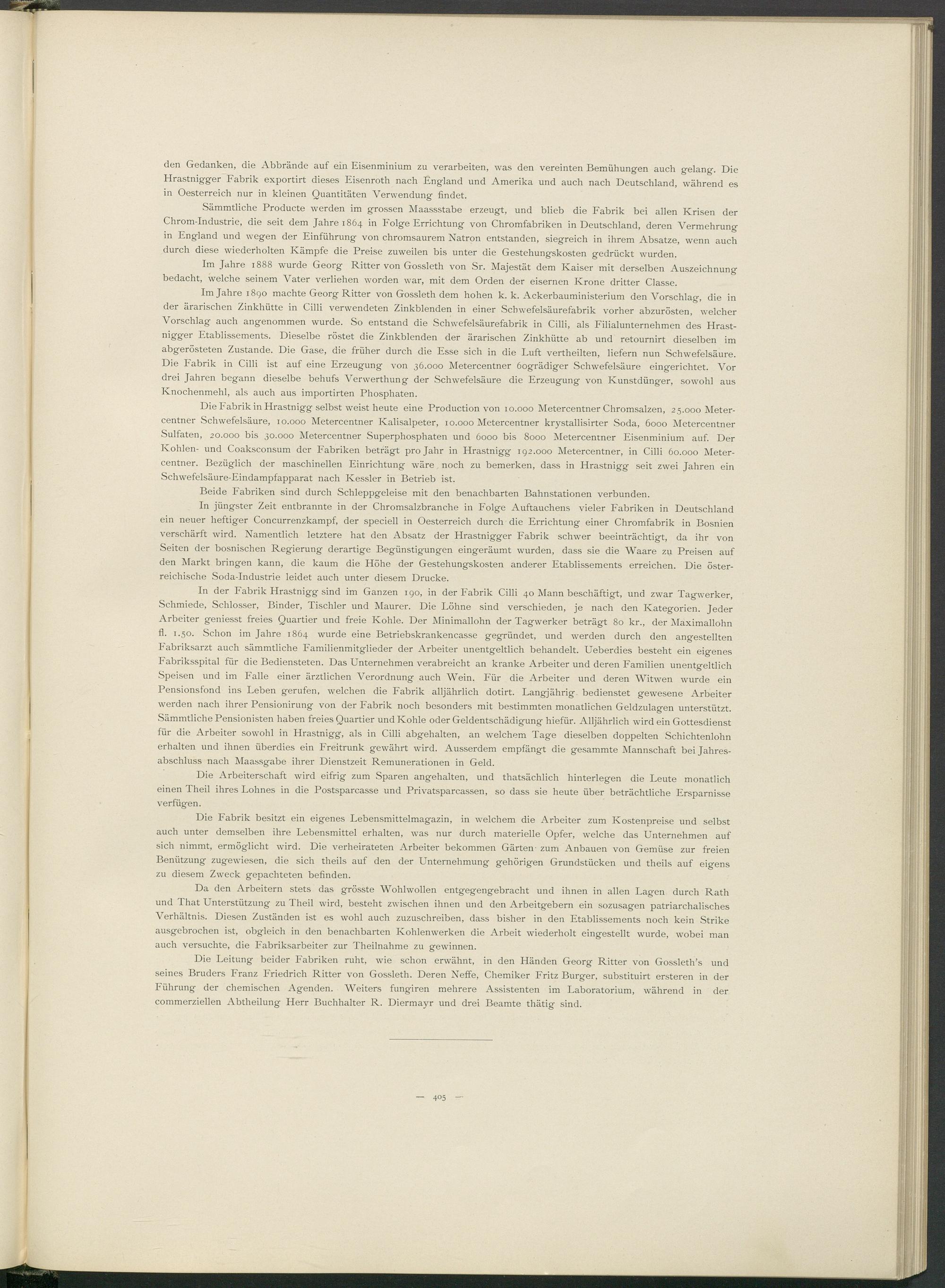 Die Fabrik in Hrastnigg selbst weist heute eine Production von 10.000 Metercentner Chromsalzen, 25.000 Metercentner Schwefelsäure, 10.000 Metercentner Kalisalpeter, 10.000 Metercentner krystallisirter Soda, 6000 Metercentner Sulfaten, 20.000 bis 30.000 Metercentner Superphosphaten und 6000 bis 8000 Metercentner Eisenminium auf. Der Kohlen- und Coaksconsum der Fabriken beträgt pro Jahr in Hrastnigg 192.000 Metercentner, in Cilli 60.000 Metercentner. Bezüglich der maschinellen Einrichtung wäre noch zu bemerken, dass in Hrastnigg seit zwei Jahren ein Schwefelsäure-Eindampfapparat nach Kessler in Betrieb ist.