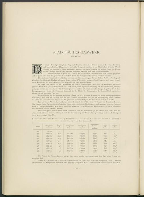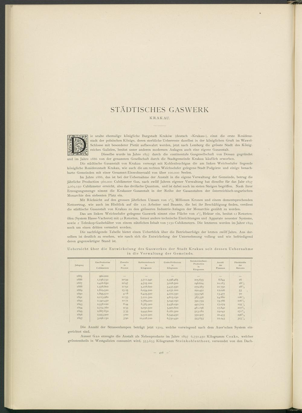 Die städtische Gasanstalt von Krakau versorgt mit Kohlenleuchtgas die am linken Weichselufer liegende königliche Residenzstadt Krakau, wie auch die am rechten Weichselufer gelegene Stadt Podgörze und einige benachbarte Gemeinden mit einer Gesammt-Einwohnerzahl von über 100.000 Seelen.