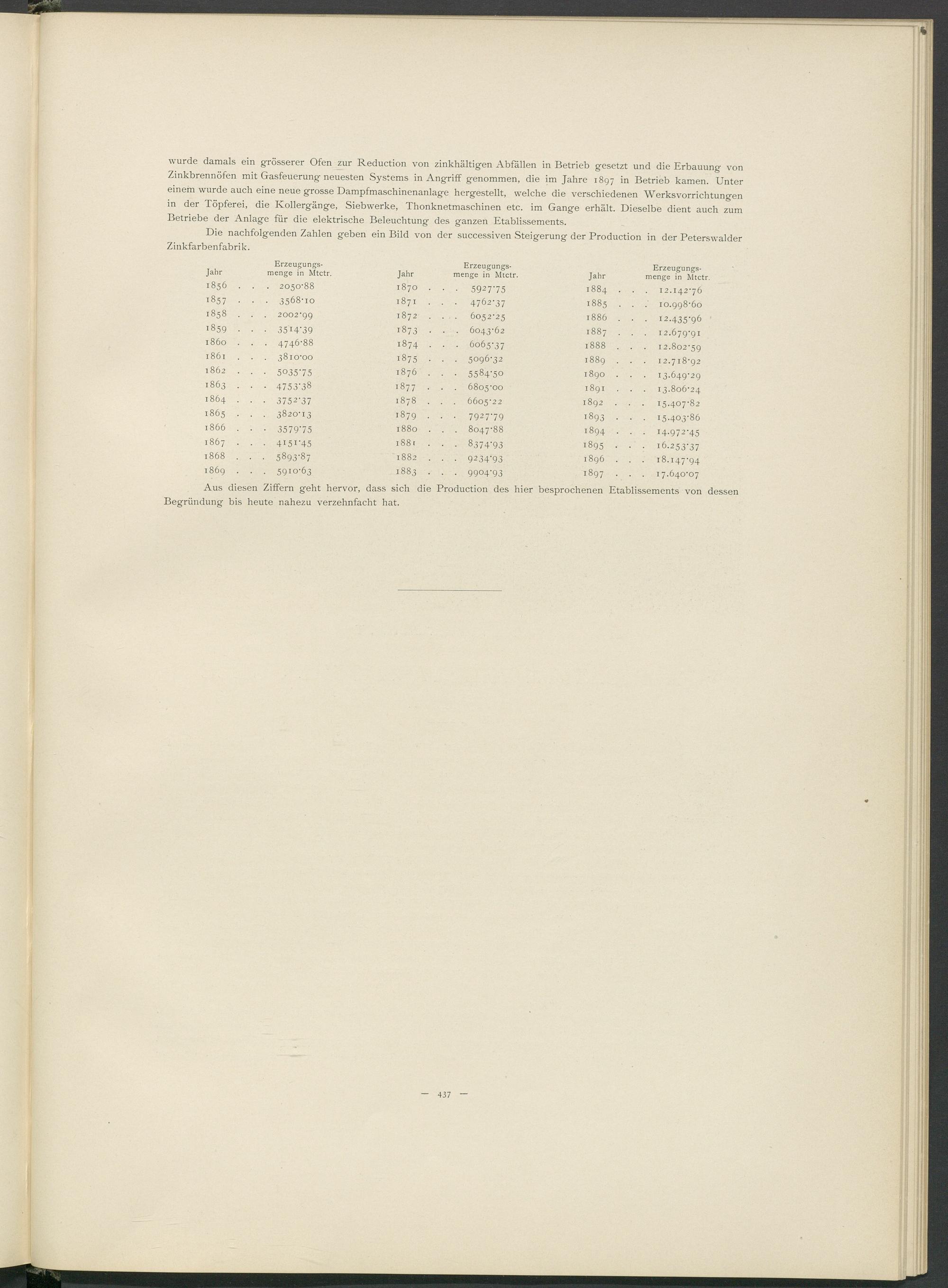 Die nachfolgenden Zahlen geben ein Bild von der successiven Steigerung der Production in der Peterswalder Zinkfarbenfabrik.