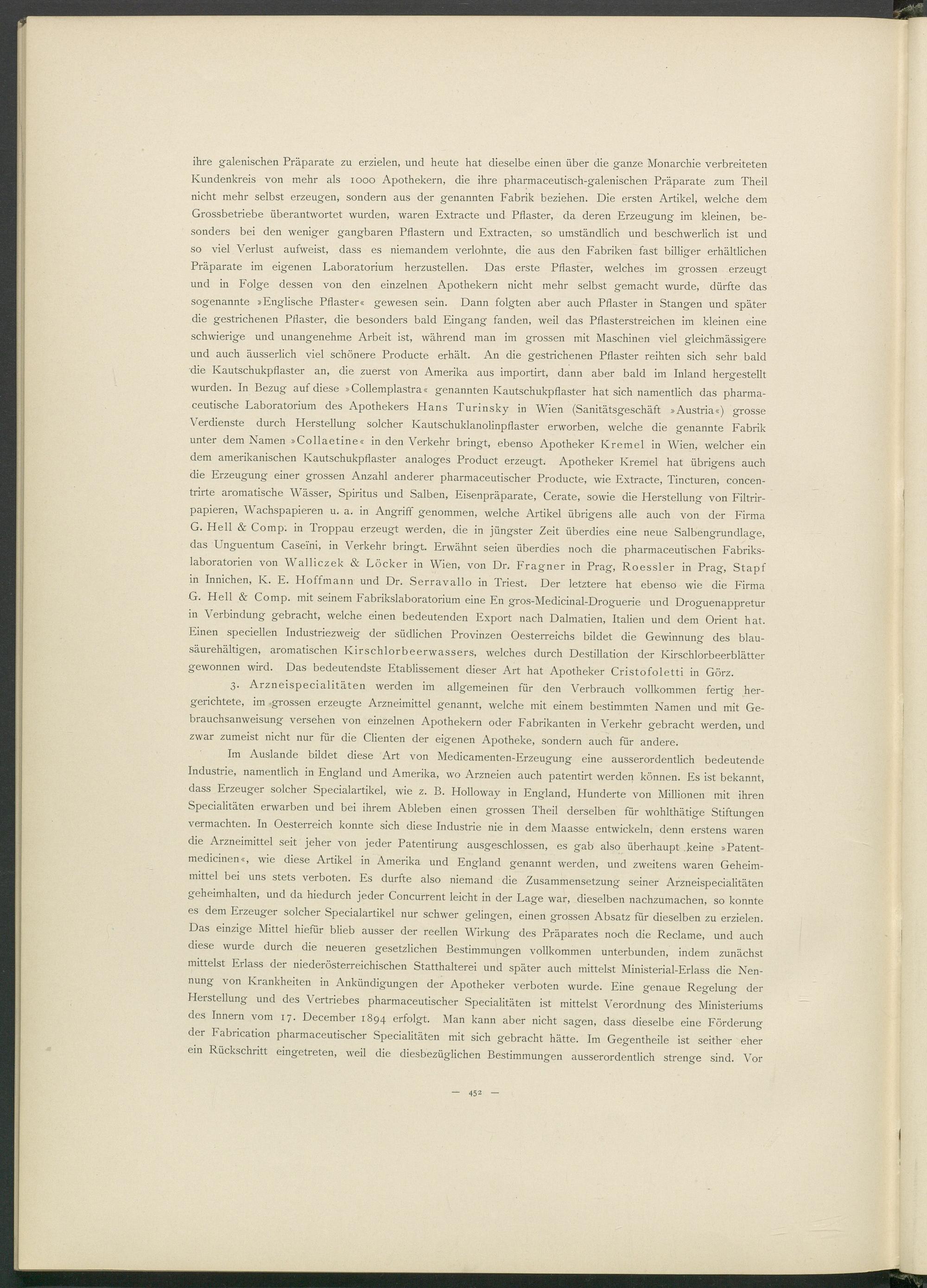 ihre galenischen Präparate zu erzielen, und heute hat dieselbe einen über die ganze Monarchie verbreiteten Kundenkreis von mehr als 1000 Apothekern, die ihre pharmaceutisch-galenischen Präparate zum Theil nicht mehr selbst erzeugen, sondern aus der genannten Fabrik beziehen. Die ersten Artikel, welche dem Grossbetriebe überantwortet wurden, waren Extracte und Pflaster, da deren Erzeugung im kleinen, besonders bei den weniger gangbaren Pflastern und Extracten, so umständlich und beschwerlich ist und so viel Verlust aufweist, dass es niemandem verlohnte, die aus den Fabriken fast billiger erhältlichen Präparate im eigenen Laboratorium herzustellen. Das erste Pflaster, welches im grossen erzeugt und in Folge dessen von den einzelnen Apothekern nicht mehr selbst gemacht wurde, dürfte das sogenannte »Englische Pflaster« gewesen sein. Dann folgten aber auch Pflaster in Stangen und später die gestrichenen Pflaster, die besonders bald Eingang fanden, weil das Pflasterstreichen im kleinen eine schwierige und unangenehme Arbeit ist, während man im grossen mit Maschinen viel gleichmässigere und auch äusserlich viel schönere Producte erhält. An die gestrichenen Pflaster reihten sich sehr bald die Kautschukpflaster an, die zuerst von Amerika aus importirt, dann aber bald im Inland hergestellt wurden. In Bezug auf diese »Collemplastra« genannten Kautschukpflaster hat sich namentlich das pharma- ceutische Laboratorium des Apothekers Hans Turinsky in Wien (Sanitätsgeschäft »Austria«) grosse Verdienste durch Herstellung solcher Kautschuklanolinpflaster erworben, welche die genannte Fabrik unter dem Namen »Collaetine« in den Verkehr bringt, ebenso Apotheker Kremei in Wien, welcher ein dem amerikanischen Kautschukpflaster analoges Product erzeugt. Apotheker Kremei hat übrigens auch die Erzeugung einer grossen Anzahl anderer pharmaceutischer Producte, wie Extracte, Tincturen, concen- trirte aromatische Wässer, Spiritus und Salben, Eisenpräparate, Cerate, sowie die Herstellung von Filtrir- papieren, Wachspapieren u. a. in Angriff genommen, welche Artikel übrigens alle auch von der Firma G. Hell & Comp: in Troppau erzeugt werden, die in jüngster Zeit überdies eine neue Salbengrundlage, das Unguentum Case'fni, in Verkehr bringt. Erwähnt seien überdies noch die pharmaceutischen Fabrikslaboratorien von Walliczek & Locker in Wien, von Dr. Fragner in Prag, Roessler in Prag, Stapf in Innichen, K. E. Hoffmann und Dr. Serravallo in Triest. Der letztere hat ebenso wie die Firma G. Hell & Comp, mit seinem Fabrikslaboratorium eine En gros-Medicinal-Droguerie und Droguenappretur in Verbindung gebracht, welche einen bedeutenden Export nach Dalmatien, Italien und dem Orient hat. Einen speciellen Industriezweig der südlichen Provinzen Oesterreichs bildet die Gewinnung des blausäur ehältigen, aromatischen Kirschlorbeerwassers, welches durch Destillation der Kirschlorbeerblätter gewonnen wird. Das bedeutendste Etablissement dieser Art hat Apotheker Cristofoletti in Görz.