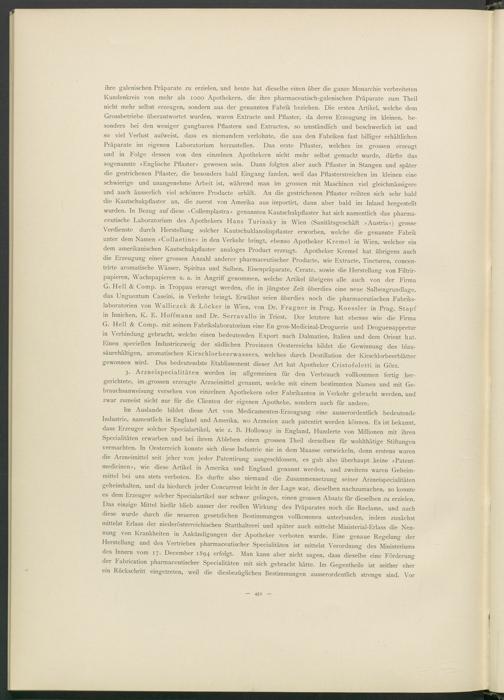 Im Auslande bildet diese Art von Medicamenten-Erzeugung eine ausserordentlich bedeutende Industrie, namentlich in England und Amerika, wo Arzneien auch patentirt werden können. Es ist bekannt, dass Erzeuger solcher Specialartikel, wie z. B. Holloway in England, Hunderte von Millionen mit ihren Specialitäten erwarben und bei ihrem Ableben einen grossen Theil derselben für wohlthätige Stiftungen vermachten. In Oesterreich konnte sich diese Industrie nie in dem Maasse entwickeln, denn erstens waren die Arzneimittel seit jeher von jeder Patentirung ausgeschlossen, es gab also überhaupt keine »Patent- medicinen«, wie diese Artikel in Amerika und England genannt werden, und zweitens waren Geheimmittel bei uns stets verboten. Es durfte also niemand die Zusammensetzung seiner Arzneispecialitäten geheimhalten, und da hiedurch jeder Concurrent leicht in der Lage war, dieselben nachzumachen, so konnte es dem Erzeuger solcher Specialartikel nur schwer gelingen, einen grossen Absatz für dieselben zu erzielen. Das einzige Mittel hiefür blieb ausser der reellen Wirkung des Präparates noch die Reclame, und auch diese wurde durch die neueren gesetzlichen Bestimmungen vollkommen unterbunden, indem zunächst mittelst Erlass der niederösterreichischen Statthalterei und später auch mittelst Ministerial-Erlass die Nennung von Krankheiten in Ankündigungen der Apotheker verboten wurde. Eine genaue Regelung der Herstellung und des Vertriebes pharmaceutischer Specialitäten ist mittelst Verordnung des Ministeriums des Innern vom 17. December 1894 erfolgt. Man kann aber nicht sagen, dass dieselbe eine Förderung der Fabrication pharmaceutischer Specialitäten mit sich gebracht hätte. Im Gegentheile ist seither eher ein Rückschritt eingetreten, weil die diesbezüglichen Bestimmungen ausserordentlich strenge sind. Vor