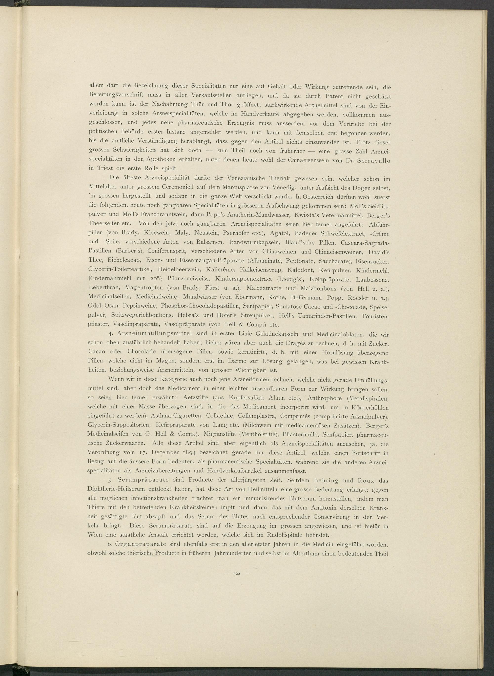 Die älteste Arzneispecialität dürfte der Venezianische Theriak gewesen sein, welcher schon im Mittelalter unter grossem Ceremoniell auf dem Marcusplatze von Venedig, unter Aufsicht des Dogen selbst, 'm grossen hergestellt und sodann in die ganze Welt verschickt wurde. In Oesterreich dürften wohl zuerst die folgenden, heute noch gangbaren Specialitäten in grösseren Aufschwung gekommen sein: Moll’s Seidlitz- pulver und Moll’s Franzbranntwein, dann Popp’s Anatherin-Mundwasser, Kwizda’s Veterinärmittel, Berger’s Theerseifen etc. Von den jetzt noch gangbaren Arzneispecialitäten seien hier ferner angeführt: Abführpillen (von Brady, Kleewein, Maly, Neustein, Pserhofer etc.), Agatol, Badener Schwefelextract, -Crème und -Seife, verschiedene Arten von Balsamen, Bandwurmkapseln, Blaud’sche Pillen, Cascara-Sagrada- Pastillen (Barber’s), Coniferensprit, verschiedene Arten von Chinaweinen und Chinaeisenweinen, David’s Thee, Eichelcacao, Eisen- und Eisenmangan-Präparate (Albuminate, Peptonate, Saccharate), Eisenzucker, Glycerin-Toiletteartikel, Heidelbeerwein, Kalicrême, Kalkeisensyrup, Kalodont, Kefirpulver, Kindermehl, Kindernährmehl mit 20% Pflanzeneiweiss, Kindersuppenextract (Liebig’s), Kolapräparate, Laabessenz, Leberthran, Magentropfen (von Brady, Fürst u. a.), Malzextracte und Malzbonbons (von Hell u. a.), Medicinalseifen, Medicinalweine, Mundwässer (von Ebermann, Ivothe, Pfeffermann, Popp, Roesler u. a.), Odol, Osan, Pepsinweine, Phosphor-Chocoladepastillen, Senfpapier, Somatose-Cacao und -Chocolade, Speisepulver, Spitzwegerichbonbons, Hebra’s und Höfer’s Streupulver, Hell’s Tamarinden-Pastillen, Touristenpflaster, Vaselinpräparate, Vasolpräparate (von Hell & Comp.) etc.