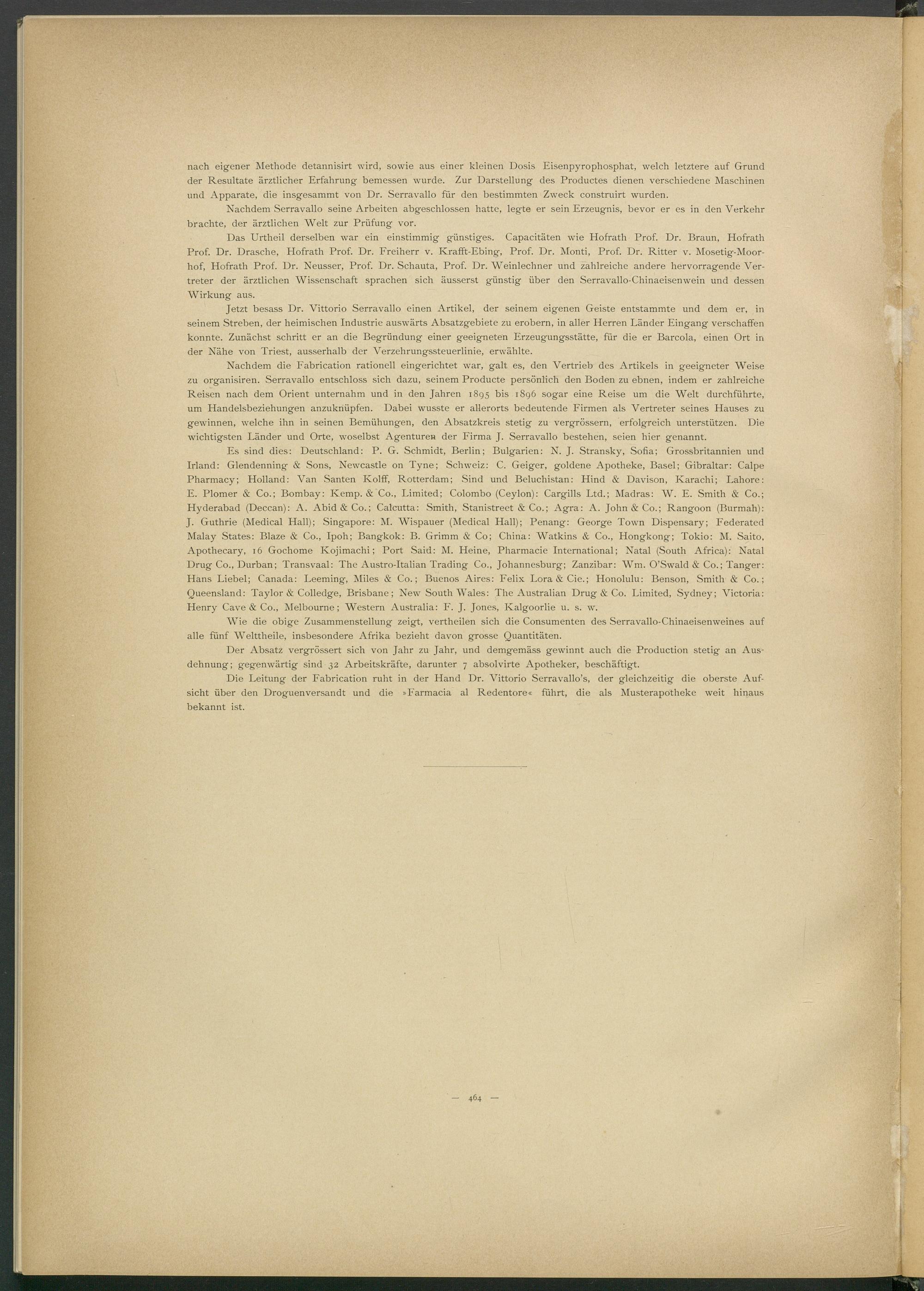 Es sind dies: Deutschland: P. G. Schmidt, Berlin; Bulgarien: N. J. Stransky, Sofia; Grossbritannien und Irland: Glendenning & Sons, Newcastle on Tyne; Schweiz: C. Geiger, goldene Apotheke, Basel; Gibraltar: Calpe Pharmacy; Holland: Van Santen Kolff, Rotterdam; Sind und Beluchistan: Hind & Davison, Karachi; Lahore: E. Plomer & Co.; Bombay: Kemp. & Co., Limited; Colombo (Ceylon): Cargills Ltd.; Madras: W. E. Smith & Co.; Hyderabad (Deccan): A. Abid & Co.; Calcutta: Smith, Stanistreet & Co.; Agra: A. John & Co.; Rangoon (Burmah): J. Guthrie (Medical Hall); Singapore: M. Wispauer (Medical Hall); Penang: George Town Dispensary; Federated Malay States: Blaze & Co., Ipoh; Bangkok: B. Grimm & Co; China: Watkins & Co., Hongkong; Tokio: M. Saito, Apothecary, 16 Gochome Kojimachi; Port Said: M. Heine, Pharmacie International; Natal (South Africa): Natal Drug Co., Durban; Transvaal: The Austro-Italian Trading Co., Johannesburg; Zanzibar: Wm. O’Swald & Co.; Tanger: Hans Liebei; Canada: Leeming, Miles & Co.; Buenos Aires: Felix Lora & Cie.; Honolulu: Benson, Smith & Co.; Queensland: Taylor & Colledge, Brisbane; New South Wales: The Australian Drug & Co. Limited, Sydney; Victoria: Henry Cave & Co., Melbourne; Western Australia: F. J. Jones, Kalgoorlie u. s. w.
