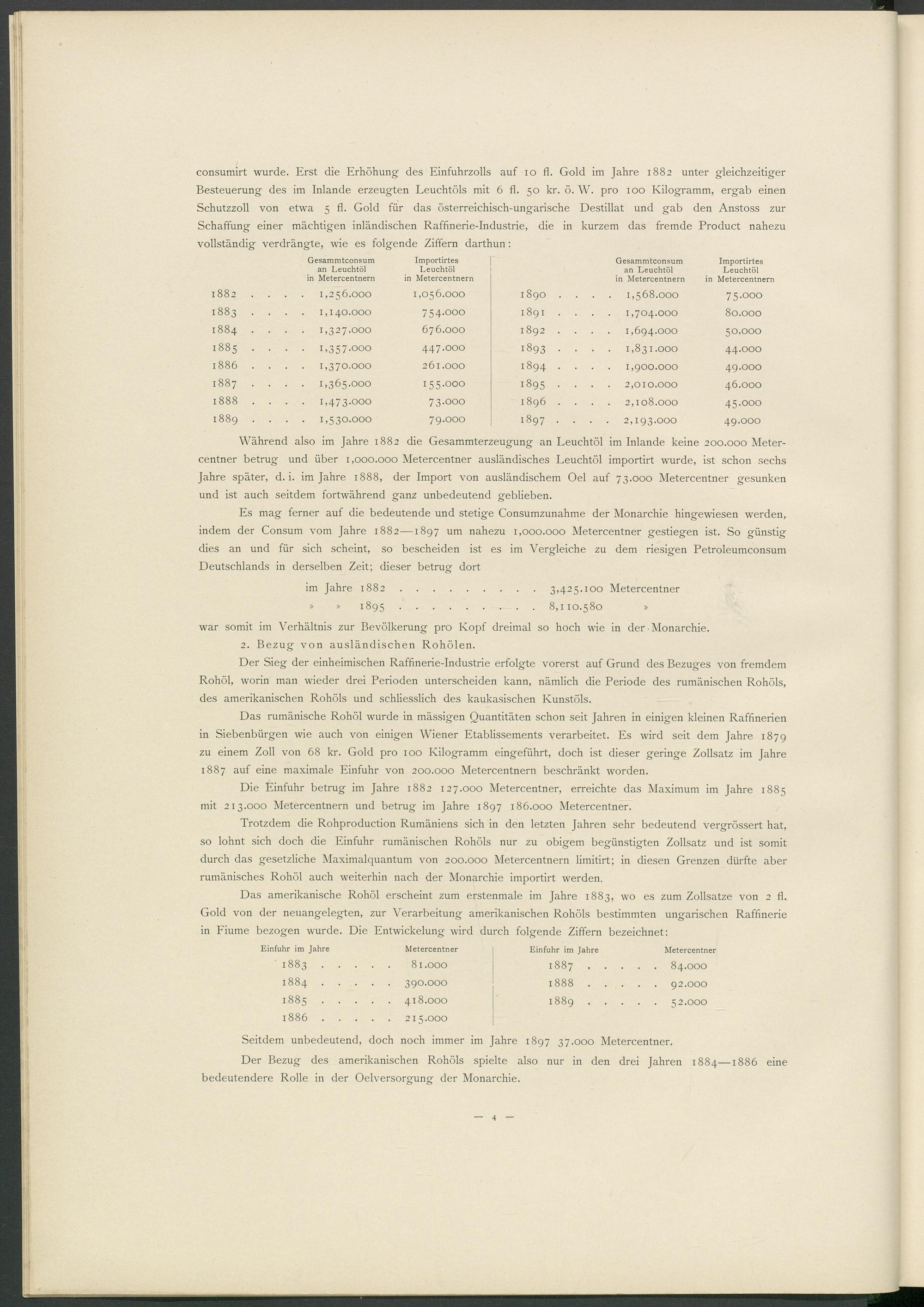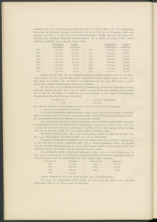 consumirt wurde. Erst die Erhöhung des Einfuhrzolls auf io fl. Gold im Jahre 1882 unter gleichzeitiger Besteuerung des im Inlande erzeugten Leuchtöls mit 6 fl. 50 kr. ö. W. pro 100 Kilogramm, ergab einen Schutzzoll von etwa 5 fl. Gold für das österreichisch-ungarische Destillat und gab den Anstoss zur Schaffung einer mächtigen inländischen Raffinerie-Industrie, die in kurzem das fremde Product nahezu vollständig verdrängte, wie es folgende Ziffern darthun: