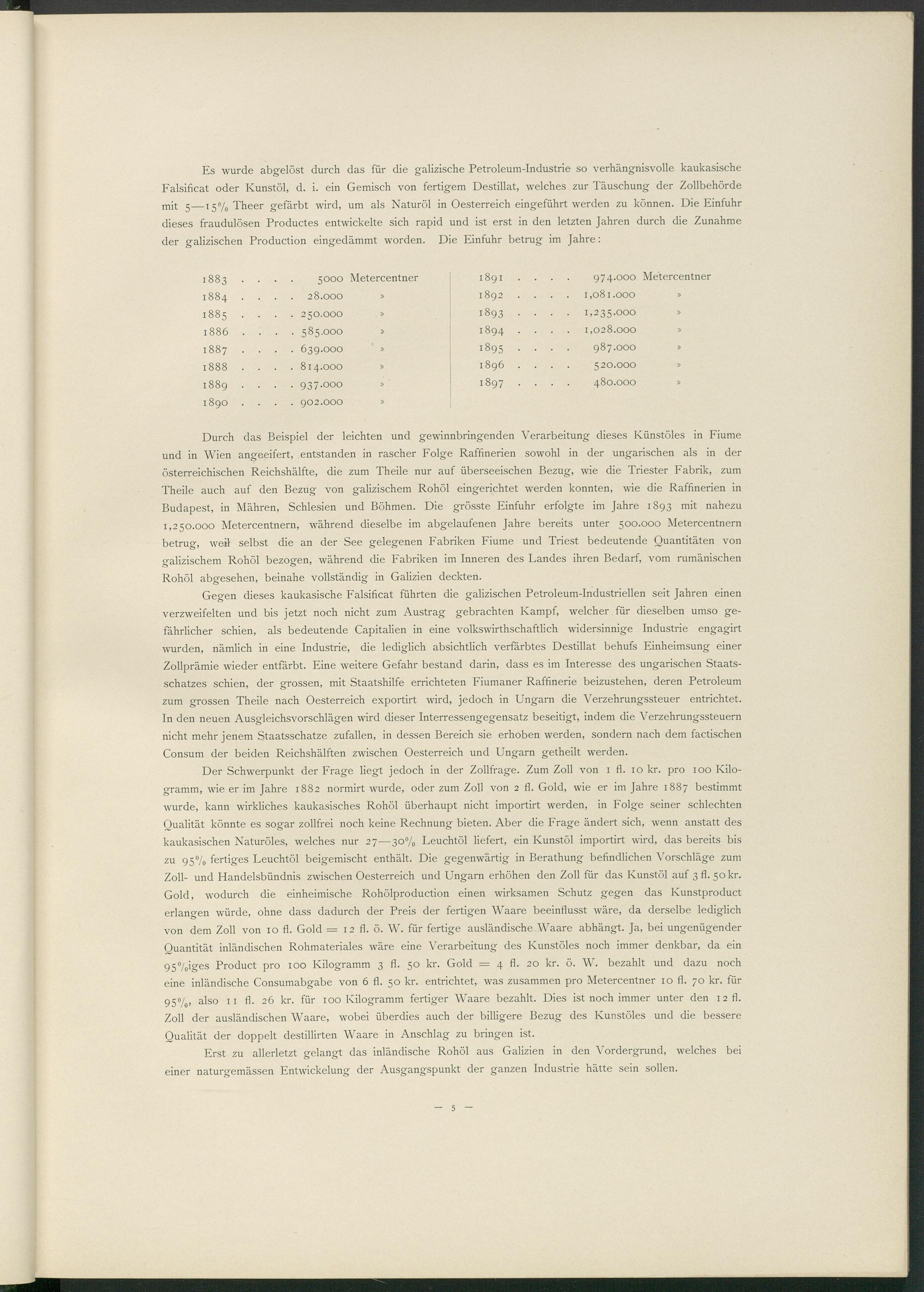 Es wurde abgelöst durch das für die galizische Petroleum-Industrie so verhängnisvolle kaukasische Falsificat oder Kunstöl, d. i. ein Gemisch von fertigem Destillat, welches zur Täuschung der Zollbehörde mit 5—15% Theer gefärbt wird, um als Naturöl in Oesterreich eingeführt werden zu können. Die Einfuhr dieses fraudulösen Productes entwickelte sich rapid und ist erst in den letzten Jahren durch die Zunahme der galizischen Production eingedämmt worden. Die Einfuhr betrug im Jahre: