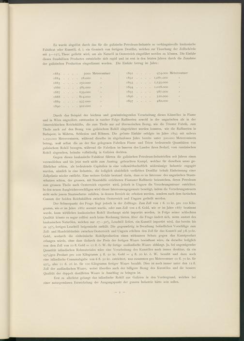 Durch das Beispiel der leichten und gewinnbringenden Verarbeitung dieses Künstöles in Fiume und in Wien angeeifert, entstanden in rascher Folge Raffinerien sowohl in der ungarischen als in der österreichischen Reichshälfte, die zum Theile nur auf überseeischen Bezug, wie die Triester Fabrik, zum Theile auch auf den Bezug von galizischem Rohöl eingerichtet werden konnten, wie die Raffinerien in Budapest, in Mähren, Schlesien und Böhmen. Die grösste Einfuhr erfolgte im Jahre 1893 mit nahezu 1,250.000 Metercentnern, während dieselbe im abgelaufenen Jahre bereits unter 500.000 Metercentnern betrug, weil selbst die an der See gelegenen Fabriken Fiume und Triest bedeutende Quantitäten von galizischem Rohöl bezogen, während die Fabriken im Inneren des Fandes ihren Bedarf, vom rumänischen Rohöl abgesehen, beinahe vollständig in Galizien deckten.