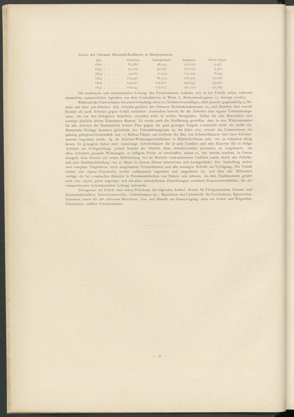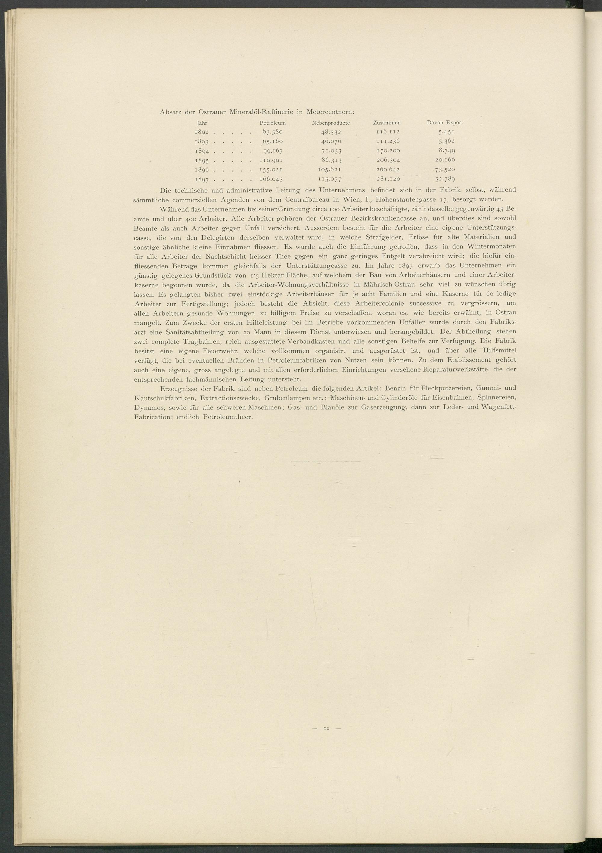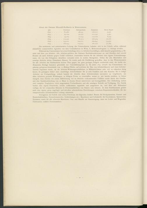Während das Unternehmen bei seiner Gründung circa 100 Arbeiter beschäftigte, zählt dasselbe gegenwärtig 45 Beamte und über 400 Arbeiter. Alle Arbeiter gehören der Ostrauer Bezirkskrankencasse an, und überdies sind sowohl Beamte als auch Arbeiter gegen Unfall versichert. Ausserdem besteht für die Arbeiter eine eigene Unterstützungs- casse, die von den Delegirten derselben verwaltet wird, in welche Strafgelder, Erlöse für alte Materialien und sonstige ähnliche kleine Einnahmen fliessen. Es wurde auch die Einführung getroffen, dass in den Wintermonaten für alle Arbeiter der Nachtschicht heisser Thee gegen ein ganz geringes Entgelt verabreicht wird; die hiefür ein- fliessenden Beträge kommen gleichfalls der Unterstützungcasse zu. Im Jahre 1897 erwarb das Unternehmen ein günstig gelegenes Grundstück von 1-5 Hektar Fläche, auf welchem der Bau von Arbeiterhäusern und einer Arbeiterkaserne begonnen wurde, da die Arbeiter-Wohnungsverhältnisse in Mährisch-Ostrau sehr viel zu wünschen übrig lassen. Es gelangten bisher zwei einstöckige Arbeiterhäuser für je acht Familien und eine Ivaserne für 60 ledige Arbeiter zur Fertigstellung; jedoch besteht die Absicht, diese Arbeitercolonie successive zu vergrössern, um allen Arbeitern gesunde Wohnungen zu billigem Preise zu verschaffen, woran es, wie bereits erwähnt, in Ostrau mangelt. Zum Zwecke der ersten Hilfeleistung bei im Betriebe vorkommenden Unfällen wurde durch den Fabriksarzt eine Sanitätsabtheilung von 20 Mann in diesem Dienst unterwiesen und herangebildet. Der Abtheilung stehen zwei complete Tragbahren, reich ausgestattete Verbandkasten und alle sonstigen Behelfe zur Verfügung. Die Fabrik besitzt eine eigene Feuerwehr, welche vollkommen organisirt und ausgerüstet ist, und über alle Hilfsmittel verfügt, die bei eventuellen Bränden in Petroleumfabriken von Nutzen sein können. Zu dem Etablissement gehört auch eine eigene, gross angelegte und mit allen erforderlichen Einrichtungen versehene Reparaturwerkstätte, die der entsprechenden fachmännischen Leitung untersteht.