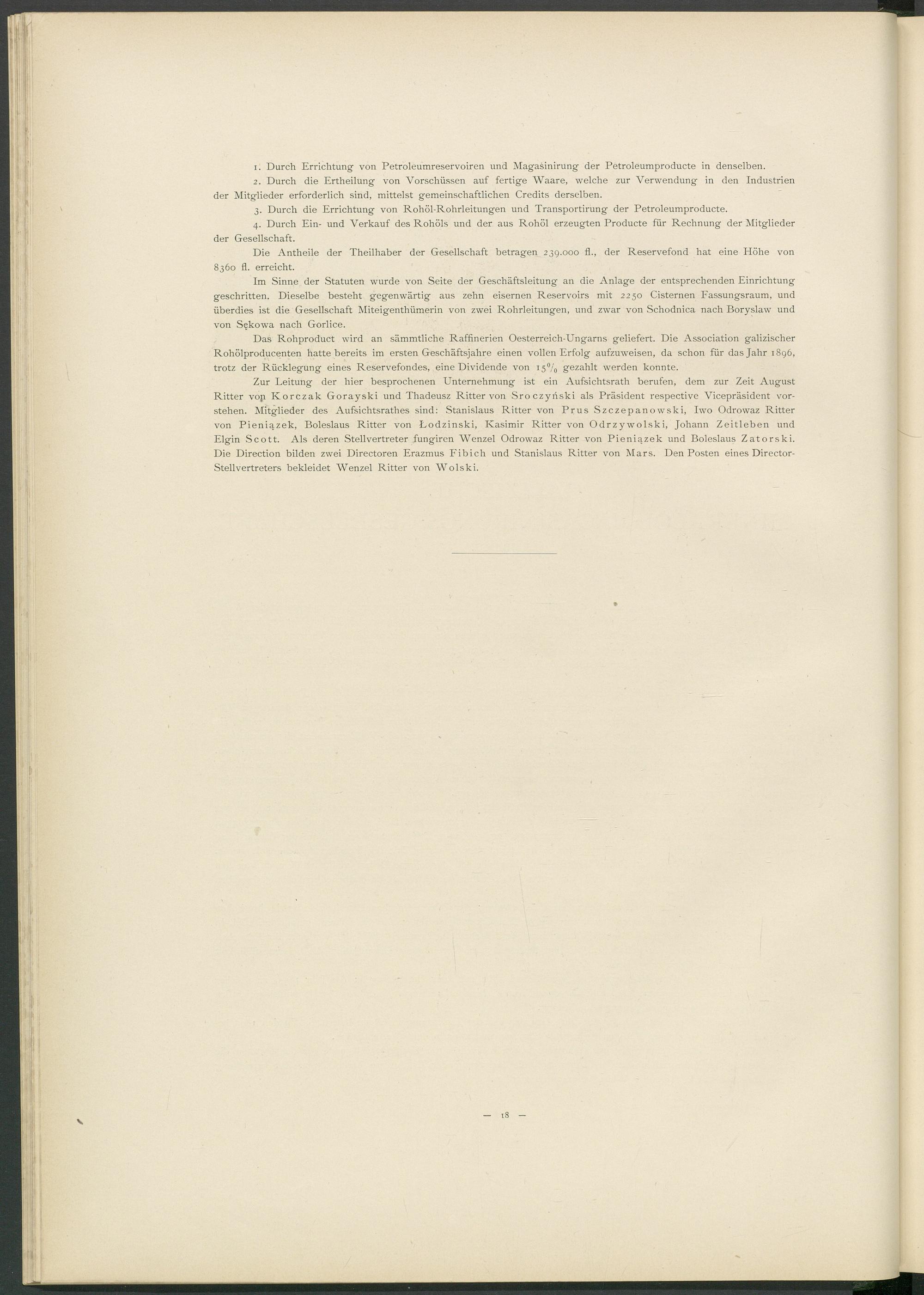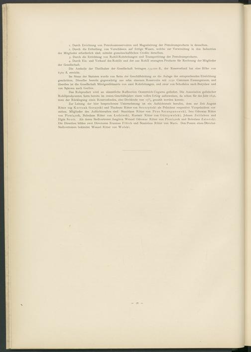 Im Sinne der Statuten wurde von Seite der Geschäftsleitung an die Anlage der entsprechenden Einrichtung geschritten. Dieselbe besteht gegenwärtig aus zehn eisernen Reservoirs mit 2250 Cisternen Fassungsraum, und überdies ist die Gesellschaft Miteigenthümerin von zwei Rohrleitungen, und zwar von Schodnica nach Boryslaw und von S^kowa nach Gorlice.