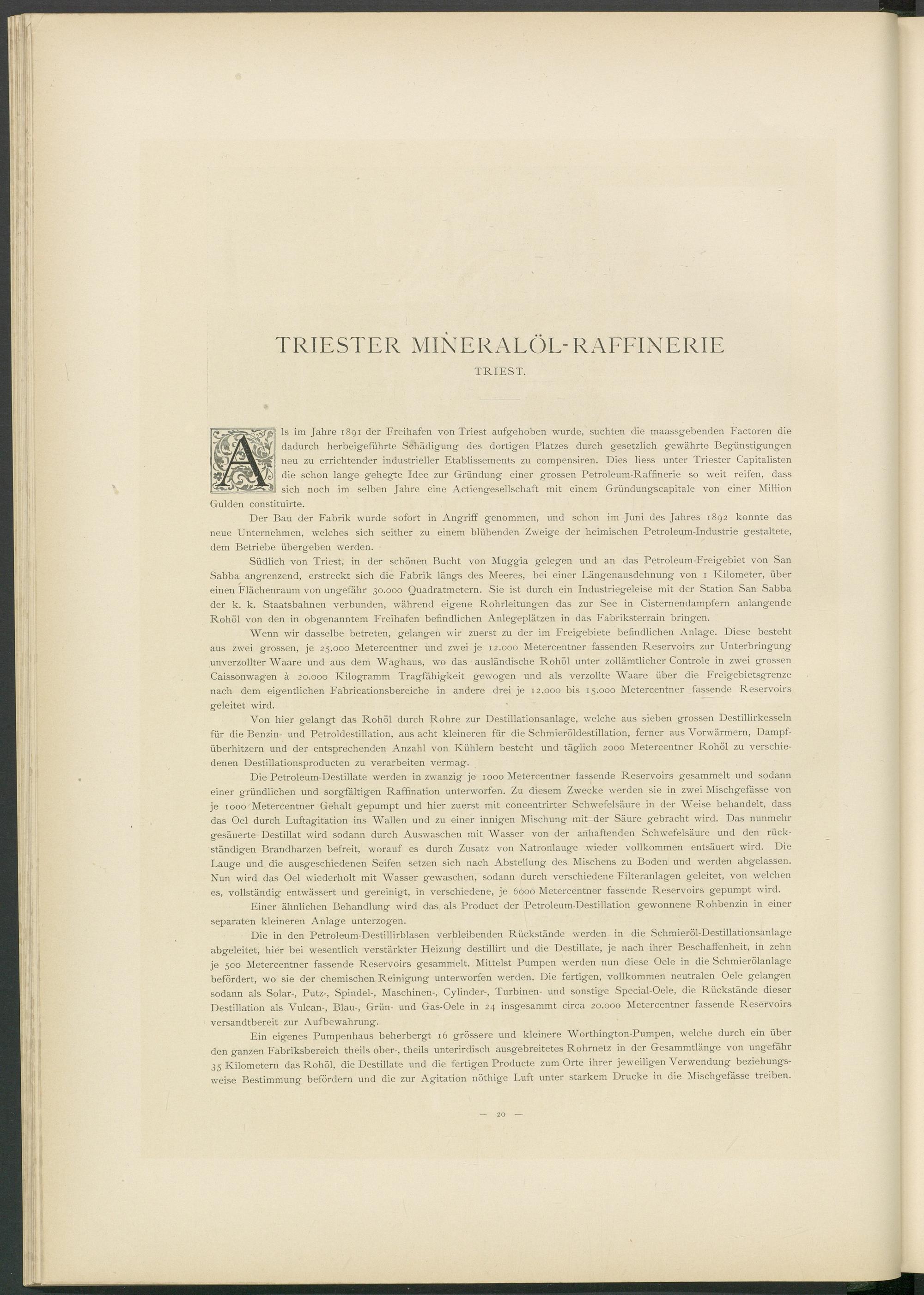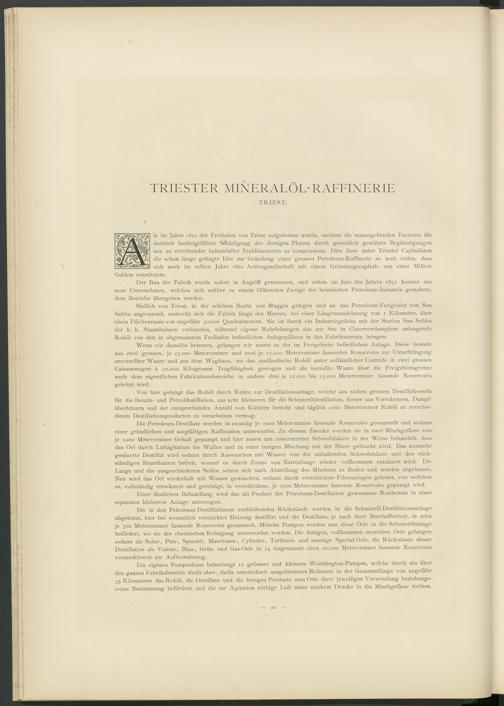 ls im Jahre 1891 der Freihafen von Triest aufgehoben wurde, suchten die maassgebenden Factoren die dadurch herbeigeführte Schädigung des dortigen Platzes durch gesetzlich gewährte Begünstigungen neu zu errichtender industrieller Etablissements zu compensiren. Dies liess unter Triester Capitalisten die schon lange gehegte Idee zur Gründung einer grossen Petroleum-Raffinerie so weit reifen, dass sich noch im selben Jahre eine Actiengesellschaft mit einem Gründungscapitale von einer Million Gulden constituirte.