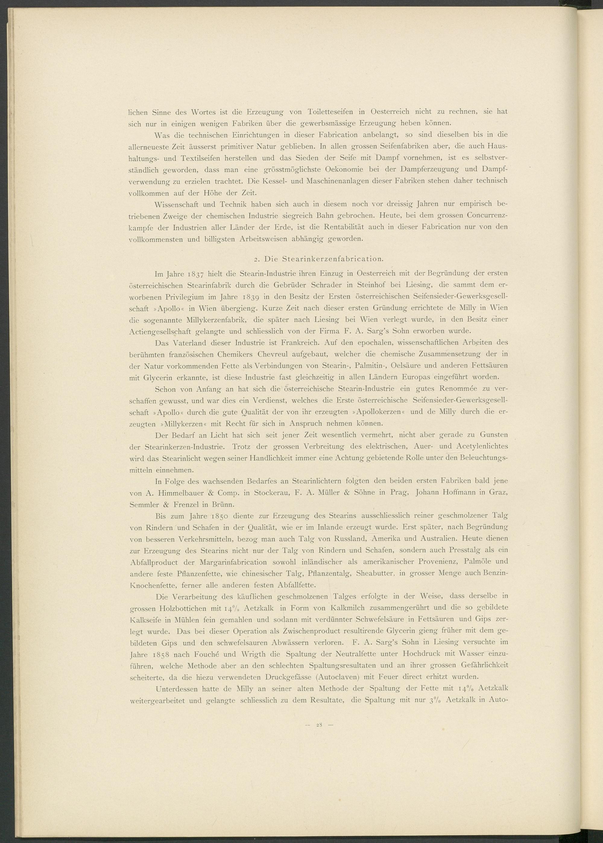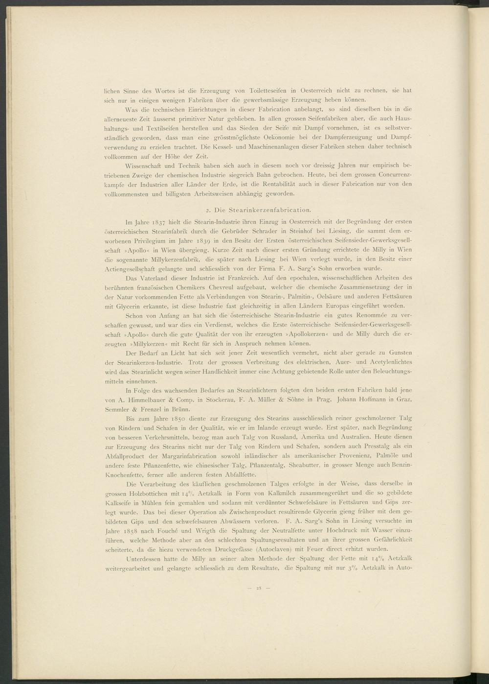 Im Jahre 1837 hielt die Stearin-Industrie ihren Einzug in Oesterreich mit der Begründung der ersten österreichischen Stearinfabrik durch die Gebrüder Schräder in Steinhof bei Liesing, die sammt dem erworbenen Privilegium im Jahre 1839 in den Besitz der Ersten österreichischen Seifensieder-Gewerksgesell- schaft »Apollo« in Wien übergieng. Kurze Zeit nach dieser ersten Gründung errichtete de Milly in Wien die sogenannte Millykerzenfabrik, die später nach Liesing bei Wien verlegt wurde, in den Besitz einer Actiengesellschaft gelangte und schliesslich von der Firma F. A. Sarg’s Sohn erworben wurde.