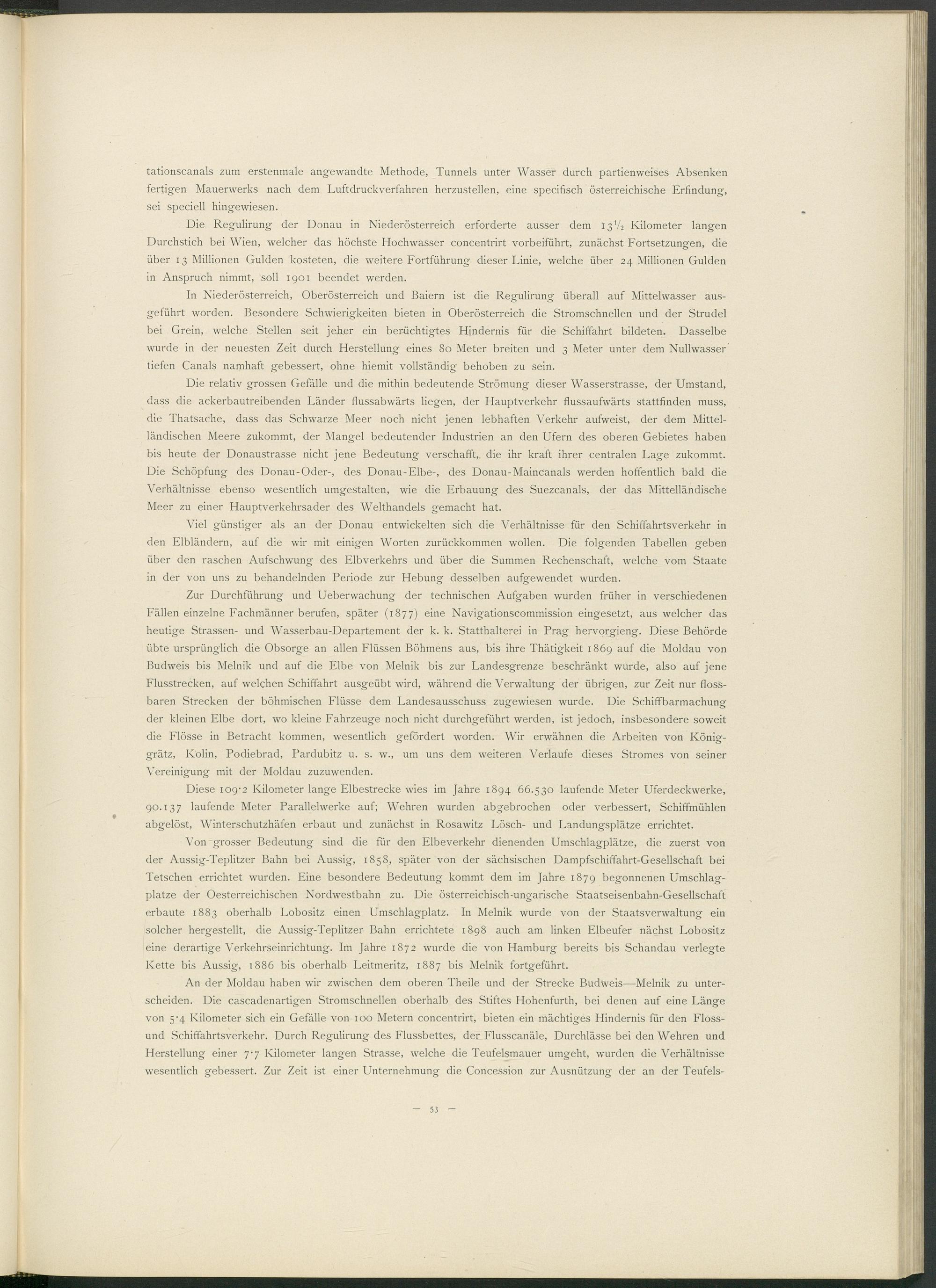 An der Moldau haben wir zwischen dem oberen Theile und der Strecke Budweis—Melnik zu unterscheiden. Die cascadenartigen Stromschnellen oberhalb des Stiftes Hohenfurth, bei denen auf eine Länge von 5-4 Kilometer sich ein Gefälle von 100 Metern concentrirt, bieten ein mächtiges Hindernis für den Floss- und Schiffahrtsverkehr. Durch Regulirung des Flussbettes, der Flusscanäle, Durchlässe bei den Wehren und Herstellung einer 7-7 Kilometer langen Strasse, welche die Teufelsmauer umgeht, wurden die Verhältnisse wesentlich gebessert. Zur Zeit ist einer Unternehmung die Concession zur Ausnützung der an der Teufels-