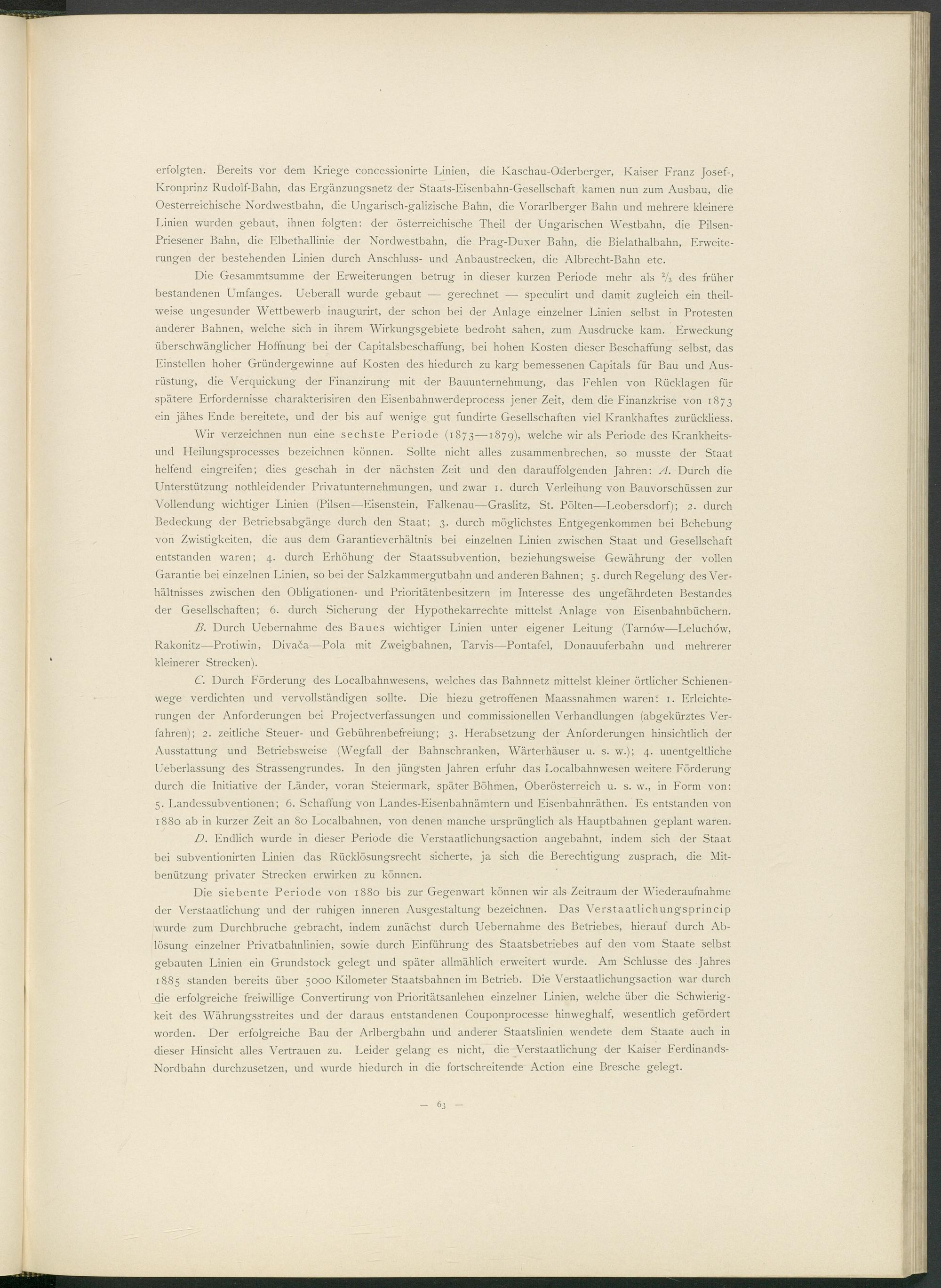 B. Durch Uebernahme des Baues wichtiger Linien unter eigener Leitung (Tarnöw—Leluchöw, Rakonitz—Protiwin, Divaca—Pola mit Zweigbahnen, Tarvis—Pontafel, Donauuferbahn und mehrerer kleinerer Strecken).