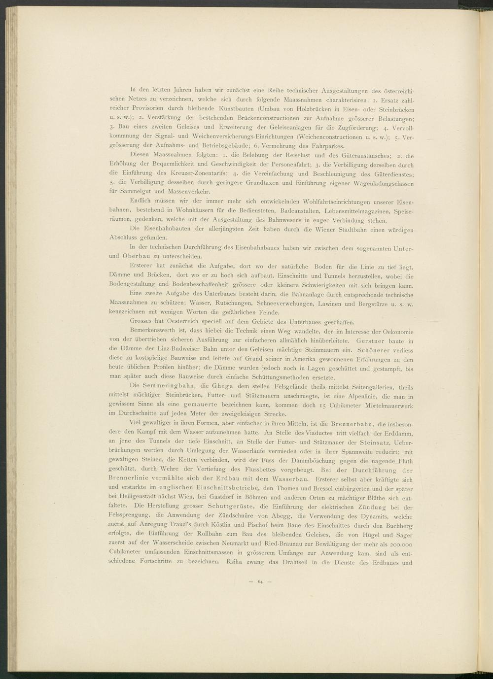 In den letzten Jahren haben wir zunächst eine Reihe technischer Ausgestaltungen des österreichischen Netzes zu verzeichnen, welche sich durch folgende Maassnahmen charakterisiren: i. Ersatz zahlreicher Provisorien durch bleibende Kunstbauten (Umbau von Holzbrücken in Eisen- oder Steinbrücken u. s. w.); 2. Verstärkung der bestehenden Brückenconstructionen zur Aufnahme grösserer Belastungen; 3. Bau eines zweiten Geleises und Erweiterung der Geleiseanlagen für die Zugförderung; 4. Vervollkommnung der Signal- und Weichenversicherungs-Einrichtungen (Weichenconstructionen u. s. w.); 5. Ver- grösserung der Aufnahms- und Betriebsgebäude; 6. Vermehrung des Fahrparkes.