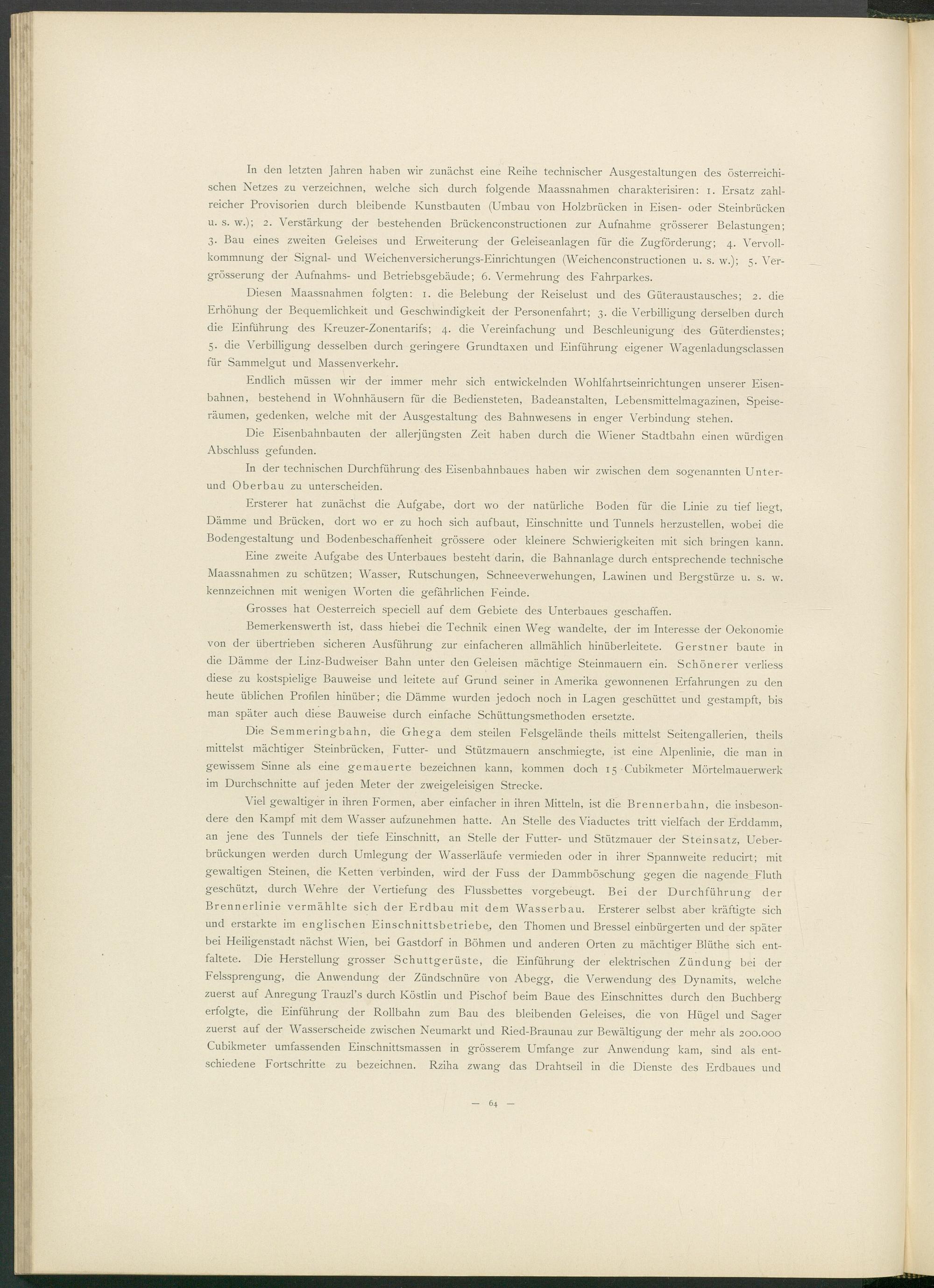 Viel gewaltiger in ihren Formen, aber einfacher in ihren Mitteln, ist die Brennerbahn, die insbesondere den Kampf mit dem Wasser aufzunehmen hatte. An Stelle des Viaductes tritt vielfach der Erddamm, an jene des Tunnels der tiefe Einschnitt, an Stelle der Futter- und Stützmauer der Steinsatz, Ueber- brückungen werden durch Umlegung der Wasserläufe vermieden oder in ihrer Spannweite reducirt; mit gewaltigen Steinen, die Ketten verbinden, wird der Fuss der Dammböschung gegen die nagende Fluth geschützt, durch Wehre der Vertiefung des Flussbettes vorgebeugt. Bei der Durchführung der Brennerlinie vermählte sich der Erdbau mit dem Wasserbau. Ersterer selbst aber kräftigte sich und erstarkte im englischen Einschnittsbetriebe, den Thomen und Bressel einbürgerten und der später bei Heiligenstadt nächst Wien, bei Gastdorf in Böhmen und anderen Orten zu mächtiger Blüthe sich entfaltete. Die Herstellung grosser Schuttgerüste, die Einführung der elektrischen Zündung bei der Felssprengung, die Anwendung der Zündschnüre von Abegg, die Verwendung des Dynamits, welche zuerst auf Anregung Trauzl’s durch Köstlin und Pischof beim Baue des Einschnittes durch den Buchberg erfolgte, die Einführung der Rollbahn zum Bau des bleibenden Geleises, die von Hügel und Säger zuerst auf der Wasserscheide zwischen Neumarkt und Ried-Braunau zur Bewältigung der mehr als 200.000 Cubikmeter umfassenden Einschnittsmassen in grösserem Umfange zur Anwendung kam, sind als entschiedene Fortschritte zu bezeichnen. Rziha zwang das Drahtseil in die Dienste des Erdbaues und