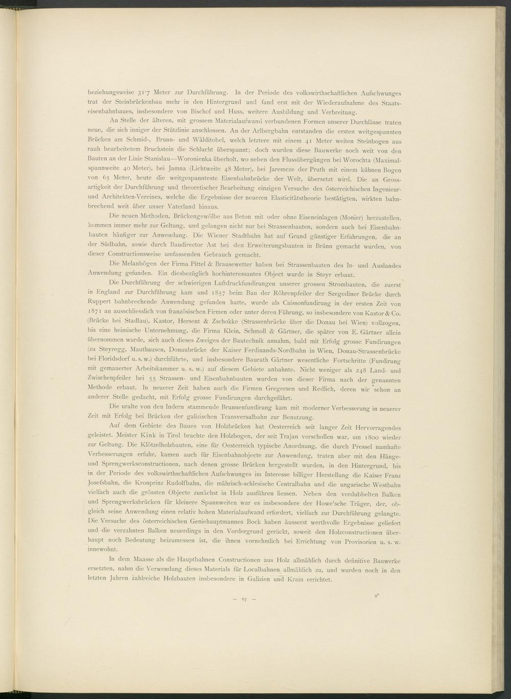 Die Durchführung der schwierigen Luftdruckfundirungen unserer grossen Strombauten, die zuerst in England zur Durchführung kam und 1857 beim Bau der Röhrenpfeiler der Szegediner Brücke durch Ruppert bahnbrechende Anwendung gefunden hatte, wurde als Caissonfundirung in der ersten Zeit von 1871 an ausschliesslich von französischen Firmen oder unter deren Führung, so insbesondere von Kastor & Co. (Brücke bei Stadlau), Kastor, Hersent & Zschokke (Strassenbrücke über die Donau bei Wien) vollzogen, bis eine heimische Unternehmung, die Firma Klein, Schmoll & Gärtner, die später von E. Gärtner allein übernommen wurde, sich auch dieses Zweiges der Bautechnik annahm, bald mit Erfolg grosse Fundirungen (zu Steyregg, Mauthausen, Donaubrücke der Kaiser Ferdinands-Nordbahn in Wien, Donau-Strassenbrücke bei Floridsdorf u. s. w.) durchführte, und insbesondere Baurath Gärtner wesentliche Fortschritte (Fundirung mit gemauerter Arbeitskammer u. s. w.) auf diesem Gebiete anbahnte. Nicht weniger als 248 Land- und Zwischenpfeiler bei 55 Strassen- und Eisenbahnbauten wurden von dieser Firma nach der genannten Methode erbaut. In neuerer Zeit haben auch die Firmen Gregersen und Redlich, deren wir schon an anderer Stelle gedacht, mit Erfolg grosse Fundirungen durchgeführt.