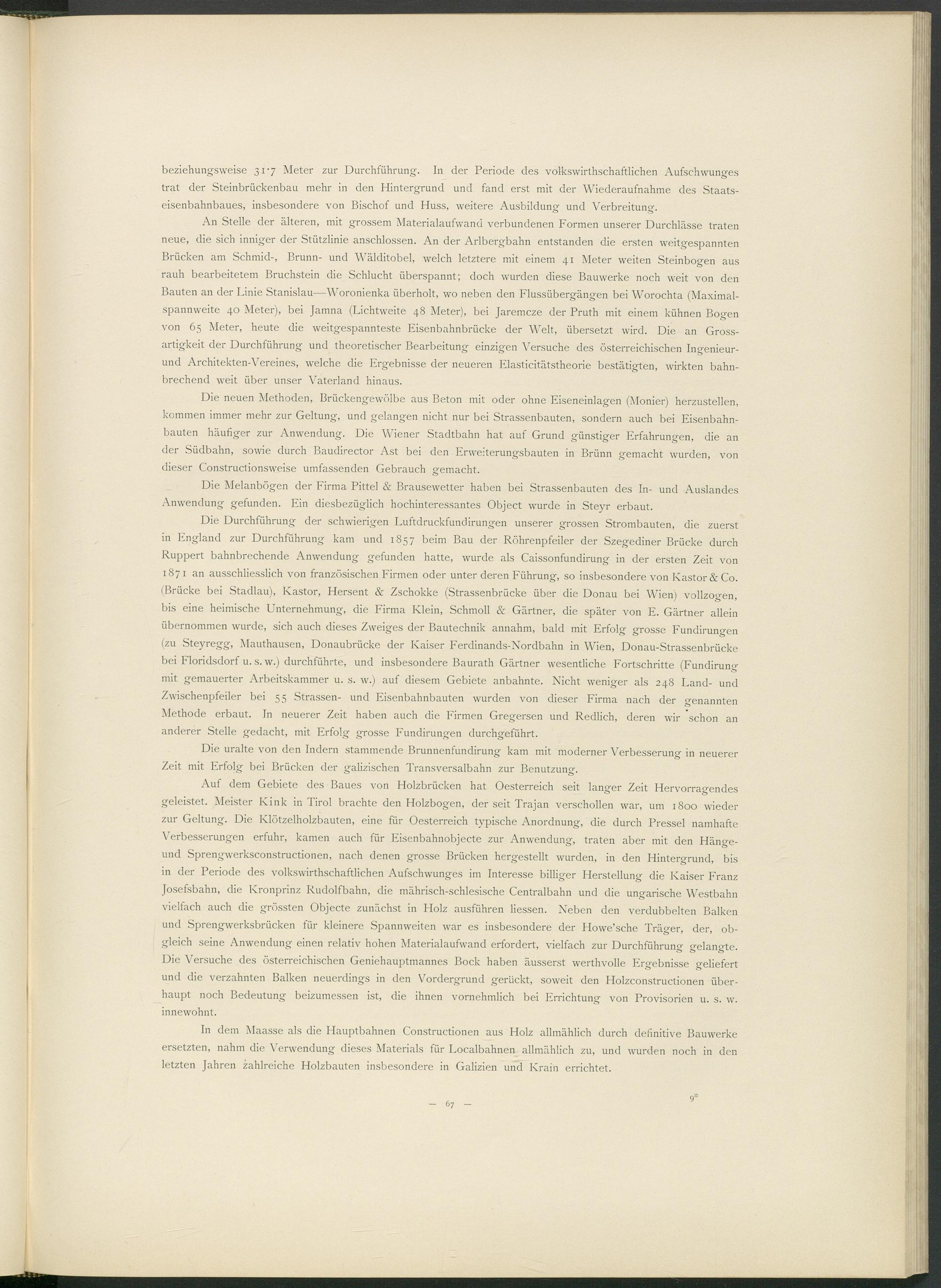 An Stelle der älteren, mit grossem Materialaufwand verbundenen Formen unserer Durchlässe traten neue, die sich inniger der Stützlinie anschlossen. An der Arlbergbahn entstanden die ersten weitgespannten Brücken am Schmid-, Brunn- und Wälditobel, welch letztere mit einem 41 Meter weiten Steinbogen aus rauh bearbeitetem Bruchstein die Schlucht überspannt; doch wurden diese Bauwerke noch weit von den Bauten an der Linie Stanislau—Woronienka überholt, wo neben den Flussübergängen bei Worochta (Maximalspannweite 40 Meter), bei Jamna (Lichtweite 48 Meter), bei Jaremcze der Pruth mit einem kühnen Bogen von 65 Meter, heute die weitgespannteste Eisenbahnbrücke der Welt, übersetzt wird. Die an Grossartigkeit der Durchführung und theoretischer Bearbeitung einzigen Versuche des österreichischen Ingenieur- und Architekten-Vereines, welche die Ergebnisse der neueren Elasticitätstheorie bestätigten, wirkten bahnbrechend weit über unser Vaterland hinaus.