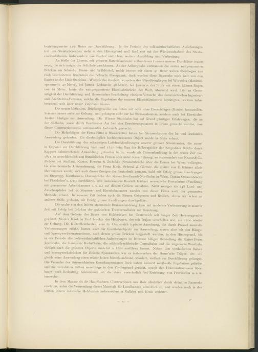 Auf dem Gebiete des Baues von Holzbrücken hat Oesterreich seit langer Zeit Hervorragendes geleistet. Meister Kink in Tirol brachte den Holzbogen, der seit Trajan verschollen war, um 1800 wieder zur Geltung. Die Klötzelholzbauten, eine für Oesterreich typische Anordnung, die durch Pressei namhafte Verbesserungen erfuhr, kamen auch für Eisenbahnobjecte zur Anwendung, traten aber mit den Hänge- und Sprengwerksconstructionen, nach denen grosse Brücken hergestellt wurden, in den Hintergrund, bis in der Periode des volkswirtschaftlichen Aufschwunges im Interesse billiger Herstellung die Kaiser Franz Josefsbahn, die Kronprinz Rudolfbahn, die mährisch-schlesische Centralbahn und die ungarische Westbahn vielfach auch die grössten Objecte zunächst in PIolz ausführen Hessen. Neben den verdubbelten Balken und Sprengwerksbrücken für kleinere Spannweiten war es insbesondere der Howe’sche Träger, der, obgleich seine Anwendung einen relativ hohen Materialaufwand erfordert, vielfach zur Durchführung gelangte. Die Versuche des österreichischen Geniehauptmannes Bock haben äusserst werthvolle Ergebnisse geliefert und die verzahnten Balken neuerdings in den Vordergrund gerückt, soweit den Holzconstructionen überhaupt noch Bedeutung beizumessen ist, die ihnen vornehmlich bei Errichtung von Provisorien u. s. w. innewohnt.