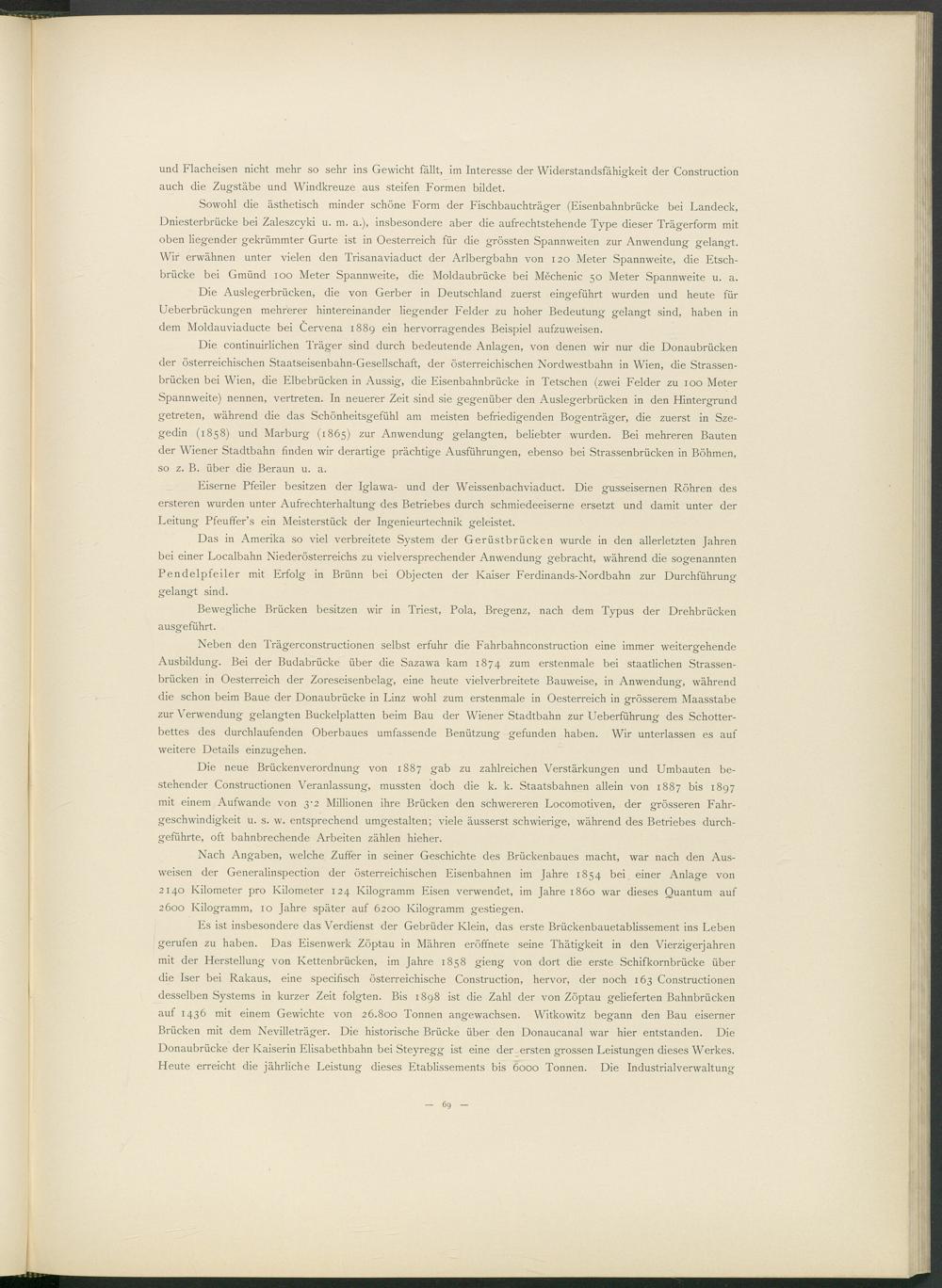 Die neue Brückenverordnung von 1887 gab zu zahlreichen Verstärkungen und Umbauten bestehender Constructionen Veranlassung, mussten doch die k. k. Staatsbahnen allein von 1887 bis 1897 mit einem Aufwande von 3-2 Millionen ihre Brücken den schwereren Locomotiven, der grösseren Fahrgeschwindigkeit u. s. w. entsprechend umgestalten; viele äusserst schwierige, während des Betriebes durchgeführte, oft bahnbrechende Arbeiten zählen hieher.