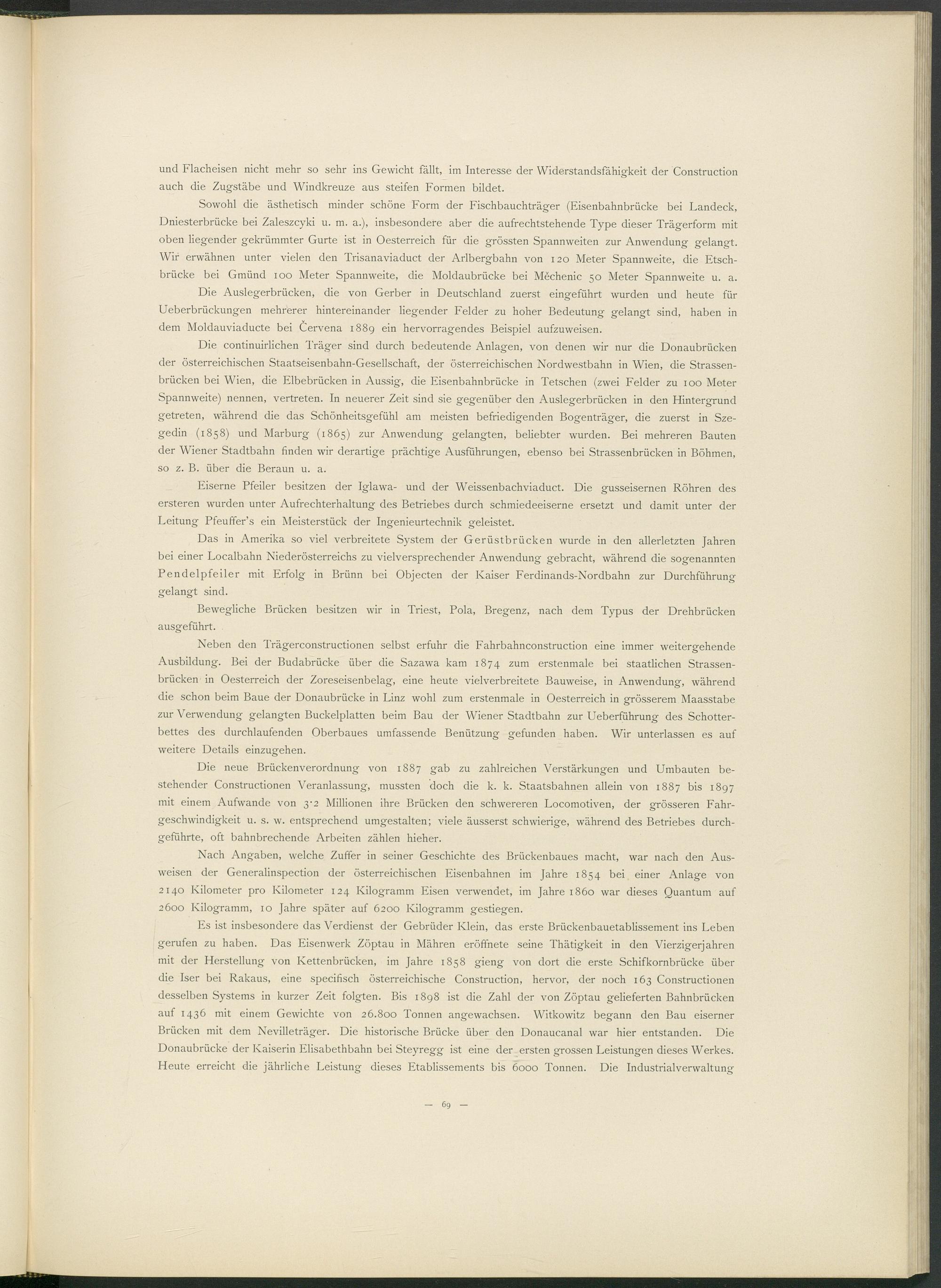 Es ist insbesondere das Verdienst der Gebrüder Klein, das erste Brückenbauetablissement ins Leben gerufen zu haben. Das Eisenwerk Zöptau in Mähren eröffnete seine Thätigkeit in den Vierzigerjahren mit der Herstellung von Kettenbrücken, im Jahre 1858 gieng von dort die erste Schifkornbrücke über die Iser bei Rakaus, eine specifisch österreichische Construction, hervor, der noch 163 Constructionen desselben Systems in kurzer Zeit folgten. Bis 1898 ist die Zahl der von Zöptau gelieferten Bahnbrücken auf 1436 mit einem Gewichte von 26.800 Tonnen angewachsen. Witkowitz begann den Bau eiserner Brücken mit dem Nevilleträger. Die historische Brücke über den Donaucanal war hier entstanden. Die Donaubrücke der Kaiserin Elisabethbahn bei Steyregg ist eine der ersten grossen Leistungen dieses Werkes. Heute erreicht die jährliche Leistung dieses Etablissements bis 6000 Tonnen. Die Industrialverwaltung