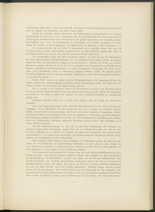 Die continuirlichen Träger sind durch bedeutende Anlagen, von denen wir nur die Donaubrücken der österreichischen Staatseisenbahn-Gesellschaft, der österreichischen Nordwestbahn in Wien, die Strassen- brücken bei Wien, die Elbebrücken in Aussig, die Eisenbahnbrücke in Tetschen (zwei Felder zu 100 Meter Spannweite) nennen, vertreten. In neuerer Zeit sind sie gegenüber den Auslegerbrücken in den Hintergrund getreten, während die das Schönheitsgefühl am meisten befriedigenden Bogenträger, die zuerst in Szegedin (1858) und Marburg (1865) zur Anwendung gelangten, beliebter wurden. Bei mehreren Bauten der Wiener Stadtbahn finden wir derartige prächtige Ausführungen, ebenso bei Strassenbrücken in Böhmen, so z. B. über die Beraun u. a.