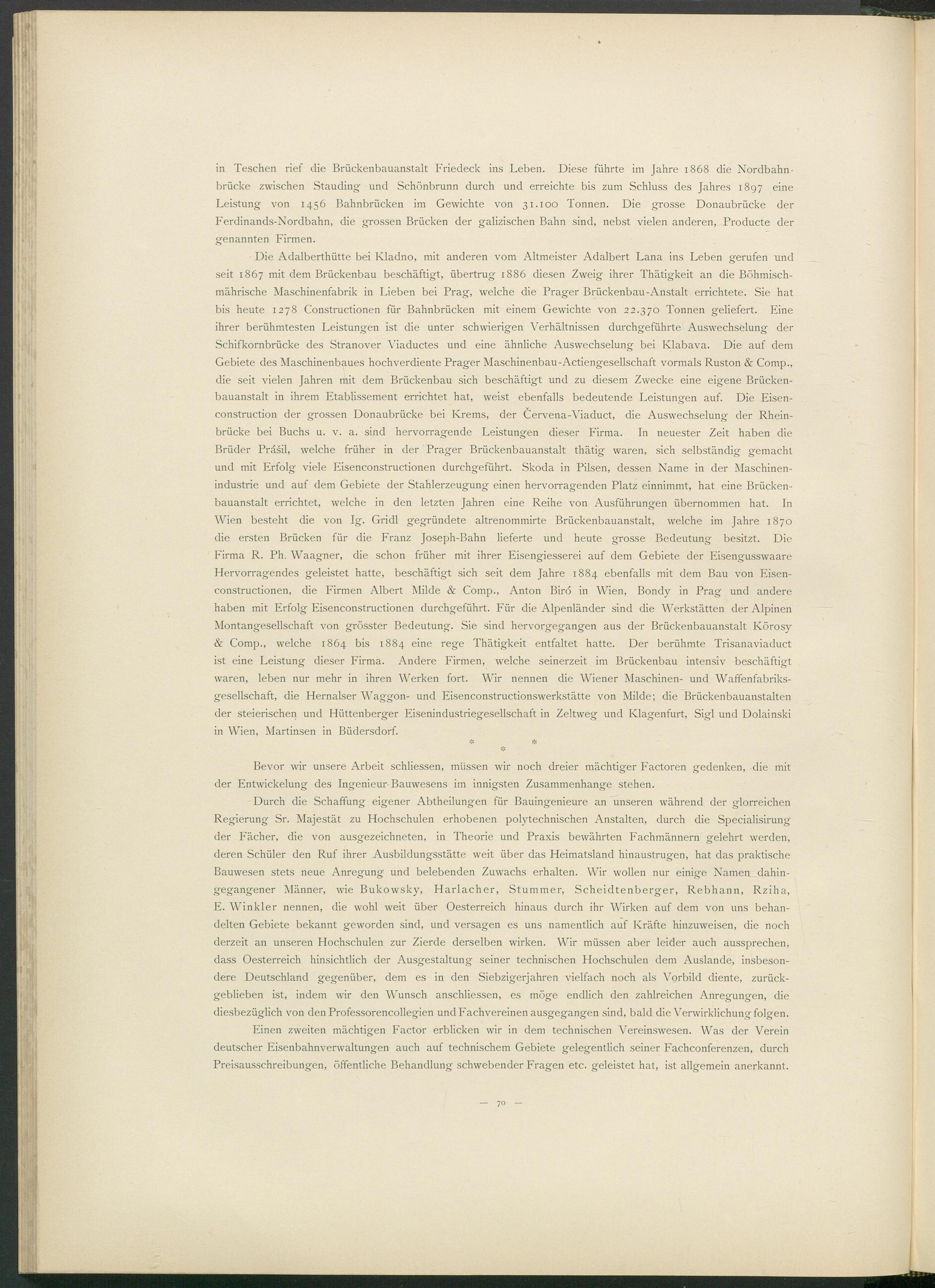 Die Adalberthütte bei Kladno, mit anderen vom Altmeister Adalbert Lana ins Leben gerufen und seit 1867 mit dem Brückenbau beschäftigt, übertrug 1886 diesen Zweig ihrer Thätigkeit an die Böhmischmährische Afaschinenfabrik in Lieben bei Prag, welche die Prager Brückenbau-Anstalt errichtete. Sie hat bis heute 1278 Constructionen für Bahnbrücken mit einem Gewichte von 22.370 Tonnen geliefert. Eine ihrer berühmtesten Leistungen ist die unter schwierigen Verhältnissen durchgeführte Auswechselung der Schifkornbrücke des Stranover Viaductes und eine ähnliche Auswechselung bei Ivlabava. Die auf dem Gebiete des Maschinenbaues hochverdiente Prager Maschinenbau-Actiengesellschaft vormals Ruston & Comp., die seit vielen Jahren mit dem Brückenbau sich beschäftigt und zu diesem Zwecke eine eigene Brückenbauanstalt in ihrem Etablissement errichtet hat, weist ebenfalls bedeutende Leistungen auf. Die Eisen- construction der grossen Donaubrücke bei Krems, der Cervena-Viaduct, die Auswechselung der Rheinbrücke bei Buchs u. v. a. sind hervorragende Leistungen dieser Firma. In neuester Zeit haben die Brüder Prasil, welche früher in der Prager Brückenbauanstalt thätig waren, sich selbständig gemacht und mit Erfolg viele Eisenconstructionen durchgeführt. Skoda in Pilsen, dessen Name in der Maschinenindustrie und auf dem Gebiete der Stahlerzeugung einen hervorragenden Platz einnimmt, hat eine Brückenbauanstalt errichtet, welche in den letzten Jahren eine Reihe von Ausführungen übernommen hat. In Wien besteht die von lg. Gridl gegründete altrenommirte Brückenbauanstalt, welche im Jahre 1870 die ersten Brücken für die Franz Joseph-Bahn lieferte und heute grosse Bedeutung besitzt. Die Firma R. Ph. Waagner, die schon früher mit ihrer Eisengiesserei auf dem Gebiete der Eisengusswaare Hervorragendes geleistet hatte, beschäftigt sich seit dem Jahre 1884 ebenfalls mit dem Bau von Eisenconstructionen, die Firmen Albert Milde & Comp., Anton Bird in Wien, Bondy in Prag und andere haben mit Erfolg Eisenconstructionen durchgeführt. Für die Alpenländer sind die Werkstätten der Alpinen Montangesellschaft von grösster Bedeutung. Sie sind hervorgegangen aus der Brückenbauanstalt Körosy & Comp., welche 1864 bis 1884 eine rege Thätigkeit entfaltet hatte. Der berühmte Trisanaviaduct ist eine Leistung dieser Firma. Andere Firmen, welche seinerzeit im Brückenbau intensiv beschäftigt waren, leben nur mehr in ihren Werken fort. Wir nennen die Wiener Maschinen- und Waffenfabriksgesellschaft, die Hernalser Waggon- und Eisenconstructionswerkstätte von Milde; die Brückenbauanstalten der steierischen und Hüttenberger Eisenindustriegesellschaft in Zeltweg und Klagenfurt, Sigl und Dolainski in Wien, Martinsen in Büdersdorf.