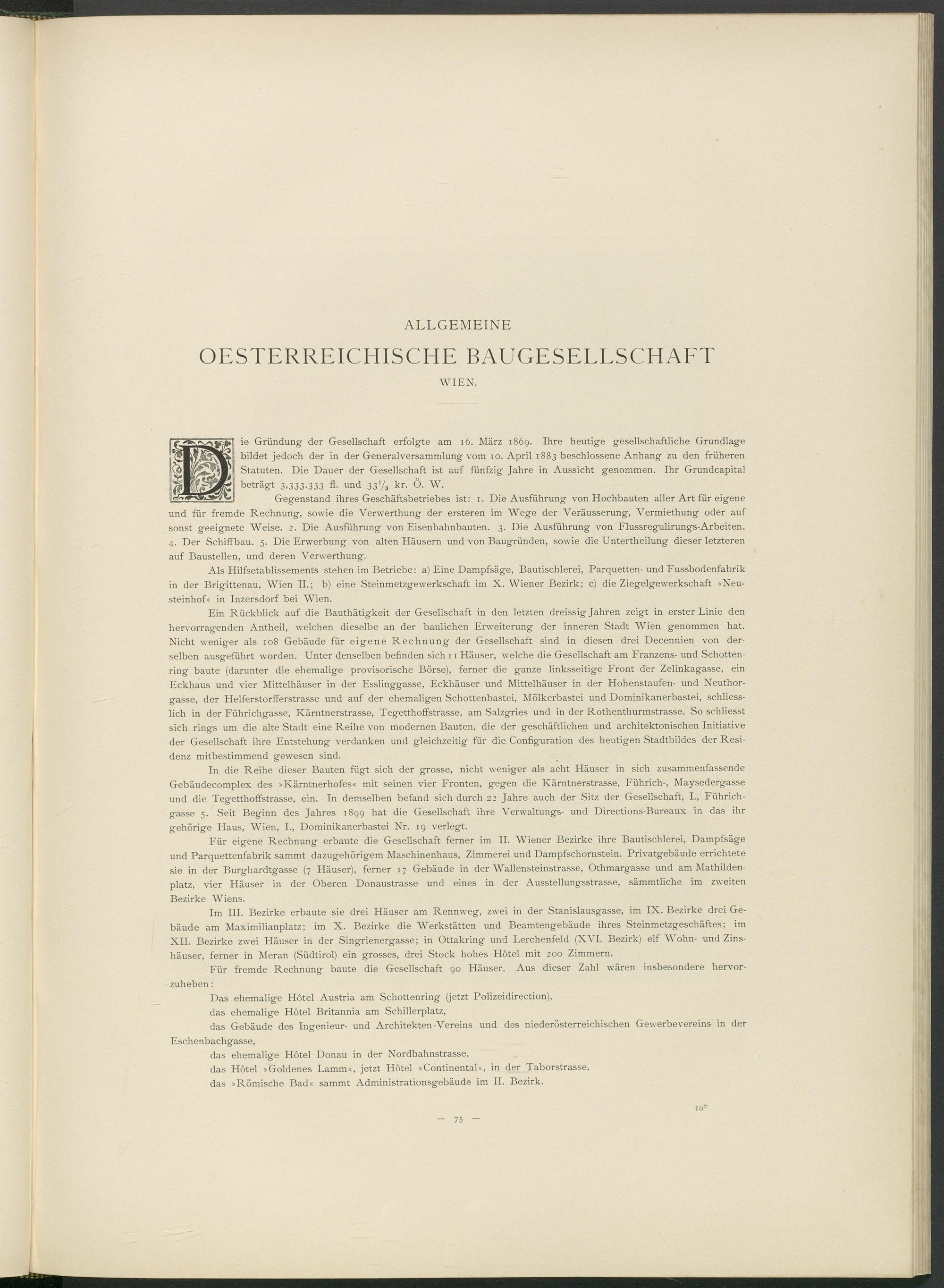 ie Gründung der Gesellschaft erfolgte am 16. März 1869. Ihre heutige gesellschaftliche Grundlage bildet jedoch der in der Generalversammlung vom 10. April 1883 beschlossene Anhang zu den früheren Statuten. Die Dauer der Gesellschaft ist auf fünfzig Jahre in Aussicht genommen. Ihr Grundcapital beträgt 3,333.333 fl. und 33V 3 kr. Ö. W.