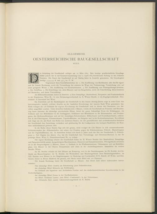 Für eigene Rechnung erbaute die Gesellschaft ferner im II. Wiener Bezirke ihre Bautischlerei, Dampfsäge und Parquettenfabrik sammt dazugehörigem Maschinenhaus, Zimmerei und Dampfschornstein. Privatgebäude errichtete sie in der Burghardtgasse (7 Häuser), ferner 17 Gebäude in der Wallensteinstrasse, Othmargasse und am Mathildenplatz, vier Häuser in der Oberen Donaustrasse und eines in der Ausstellungsstrasse, sämmtliche im zweiten Bezirke Wiens.