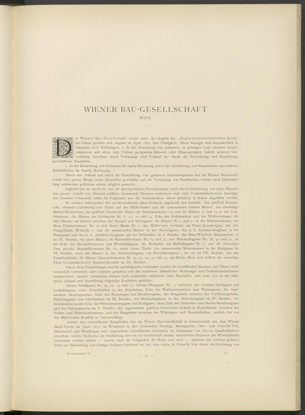 ie Wiener Bau-Gesellschaft wurde unter der Aegide der »Anglo-Oesterreichischen Bank« ins Leben gerufen und begann im April 1869 ihre Thätigkeit. Diese bewegte sich hauptsächlich in folgenden zwei Richtungen: 1. In der Erwerbung von grösseren, in günstiger Lage situirten Grund- complexen und alten, zum Umbau geeigneten Häusern oder Häusergruppen behufs weiterer Ver- werthung derselben durch Verbauung oder Verkauf der durch die Parcellirung und Demolirung geschaffenen Baustellen.