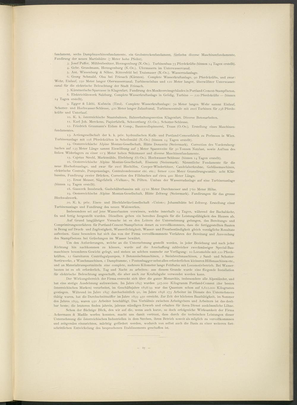 16. Oesterreichische Alpine Montan-Gesellschaft, Eisenerz (Steiermark). Sämmtliche Fundamente für die neue Hochofenanlage, und zwar für zwei Hochöfen, Cowper-Winderhitzer, Candelaberkrahne, Gebläsemaschinen, elektrische Centrale, Pumpenanlage, Centralcondensator etc. etc.; ferner 1200 Meter Granulirungscanäle, acht Klärbassins, Fundirung zweier Brücken, Correction des Fölzbaches auf circa 400 Meter Länge.