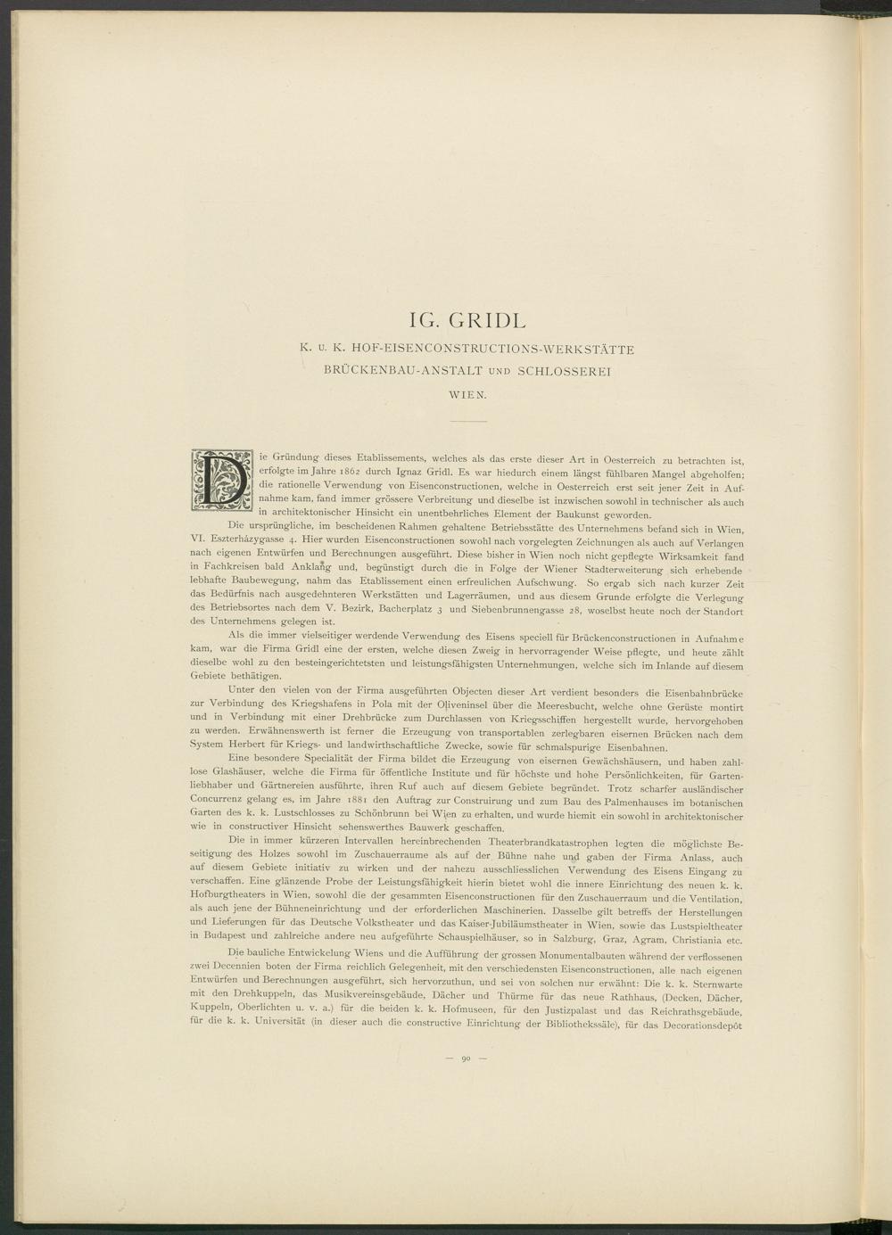 ie Gründung dieses Etablissements, welches als das erste dieser Art in Oesterreich zu betrachten ist, erfolgte im Jahre 1862 durch Ignaz Gridl. Es war hiedurch einem längst fühlbaren Mangel abgeholfen; die rationelle Verwendung von Eisenconstructionen, welche in Oesterreich erst seit jener Zeit in Aufnahme kam, fand immer grössere Verbreitung und dieselbe ist inzwischen sowohl in technischer als auch in architektonischer Hinsicht ein unentbehrliches Element der Baukunst geworden.