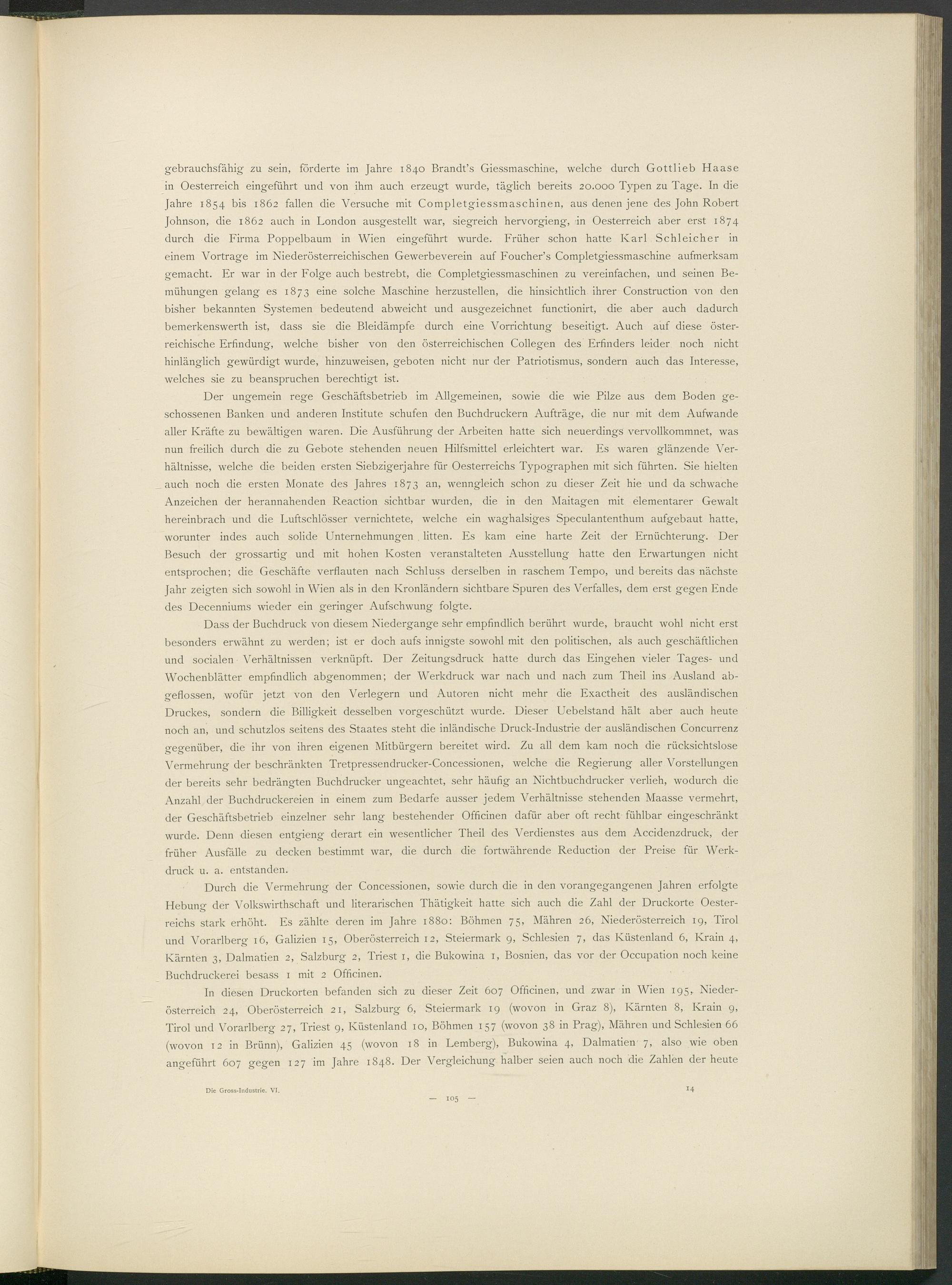 In diesen Druckorten befanden sich zu dieser Zeit 607 Officinen, und zwar in Wien 195, Niederösterreich 24, Oberösterreich 21, Salzburg 6, Steiermark 19 (wovon in Graz 8), Kärnten 8, Krain 9, Tirol und Vorarlberg 27, Triest 9, Küstenland 10, Böhmen 157 (wovon 38 in Prag), Mähren und Schlesien 66 (wovon 12 in Brünn), Galizien 45 (wovon 18 in Lemberg), Bukowina 4, Dalmatien 7, also wie oben angeführt 607 gegen 127 im Jahre 1848. Der Vergleichung halber seien auch noch die Zahlen der heute