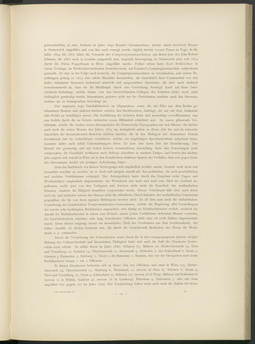 Dass der Buchdruck von diesem Niedergange sehr empfindlich berührt wurde, braucht wohl nicht erst besonders erwähnt zu werden; ist er doch aufs innigste sowohl mit den politischen, als auch geschäftlichen und socialen Verhältnissen verknüpft. Der Zeitungsdruck hatte durch das Eingehen vieler Tages- und Wochenblätter empfindlich abgenommen; der Werkdruck war nach und nach zum Theil ins Ausland abgeflossen, wofür jetzt von den Verlegern und Autoren nicht mehr die Exactheit des ausländischen Druckes, sondern die Billigkeit desselben vorgeschützt wurde. Dieser Uebelstand hält aber auch heute noch an, und schutzlos seitens des Staates steht die inländische Druck-Industrie der ausländischen Concurrenz gegenüber, die ihr von ihren eigenen Mitbürgern bereitet wird. Zu all dem kam noch die rücksichtslose Vermehrung der beschränkten Tretpressendrucker-Concessionen, welche die Regierung aller Vorstellungen der bereits sehr bedrängten Buchdrucker ungeachtet, sehr häufig an Nichtbuchdrucker verlieh, wodurch die Anzahl der Buchdruckereien in einem zum Bedarfe ausser jedem Verhältnisse stehenden Maasse vermehrt, der Geschäftsbetrieb einzelner sehr lang bestehender Officinen dafür aber oft recht fühlbar eingeschränkt wurde. Denn diesen entgieng derart ein wesentlicher Theil des Verdienstes aus dem Accidenzdruck, der früher Ausfälle zu decken bestimmt war, die durch die fortwährende Reduction der Preise für Werkdruck u. a. entstanden.