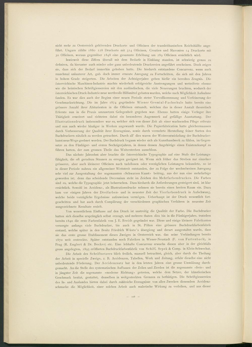 Das nächste Jahrzehnt aber brachte die österreichische Typographie auf eine Stufe der Leistungsfähigkeit, die oft geradezu Staunen zu erregen geeignet ist. Wenn sich früher das Streben nur einzelner grösserer, aber auch kleinerer Officinen nach tadellosen oder vorzüglichen Leistungen bekundete, so ist in dieser Periode nahezu ein allgemeiner Wettstreit entstanden, der zu Folge der wechselweisen Anregung sehr viel zur Ausgestaltung der sogenannten »Schwarzen Kunst« beitrug, aus der nun eine mehrfarbige geworden ist; denn das scheidende Decennium steht im Zeichen des Mehrfarbendruckes. Die Farben sind es, welche die Typographie jetzt beherrschen. Dass hiedurch die Anforderungen gesteigert sind, ist klar ersichtlich. Sowohl im Accidenz-, als Illustrationsdrucke nehmen sie 'bereits einen breiten Raum ein. Dazu kam vor einigen Jahren der Dreifarben- und in neuester Zeit der Vierfarbendruck in Aufschwung, welche beide vorzügliche Ergebnisse aufzuweisen vermögen. Ueberhaupt ist der Druck wesentlich fortgeschritten und hat auch durch Compilirung der verschiedenen graphischen Verfahren in neuester Zeit ausgezeichnete Resultate erzielt.