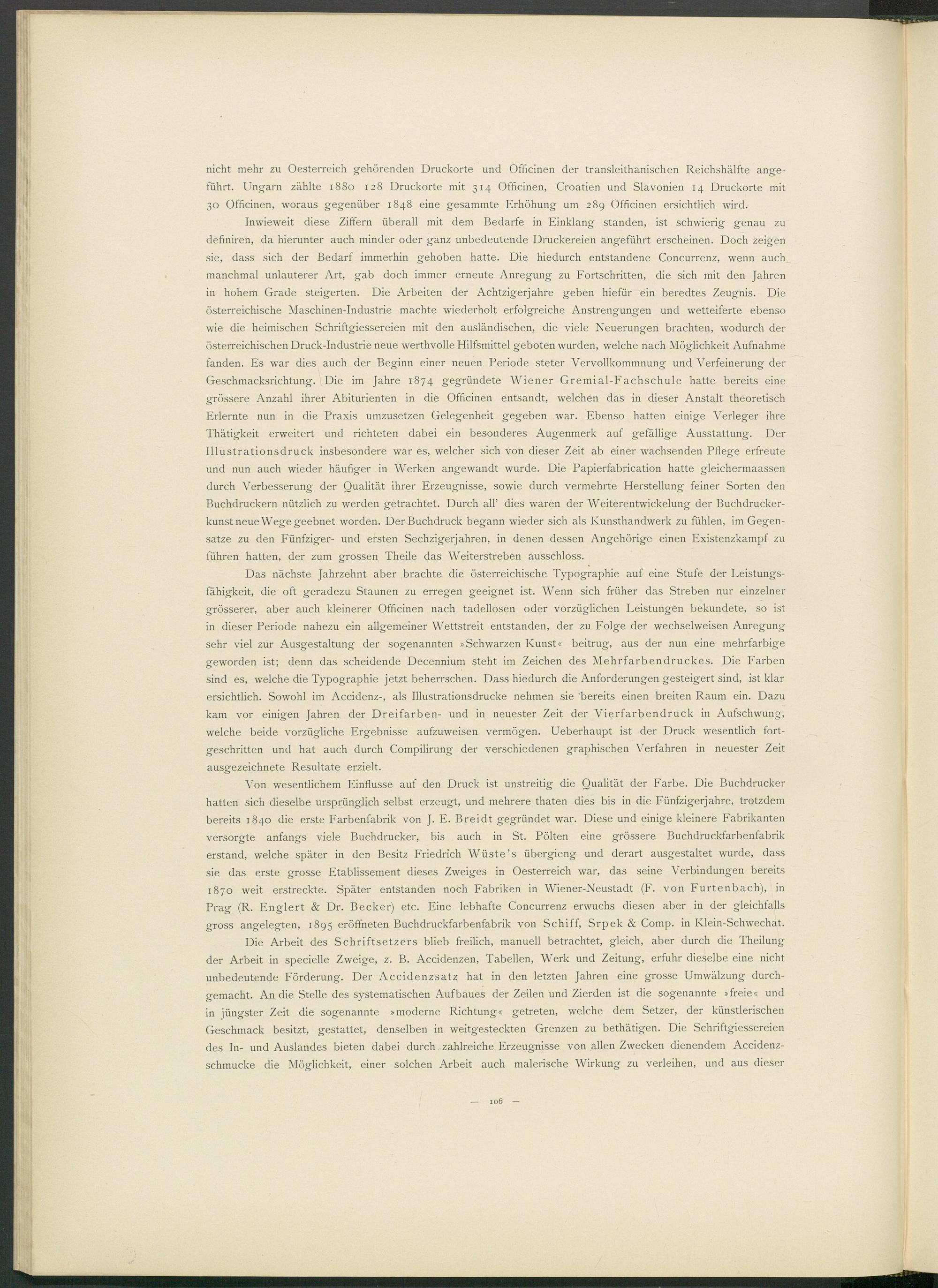 Von wesentlichem Einflüsse auf den Druck ist unstreitig die Qualität der Farbe. Die Buchdrucker hatten sich dieselbe ursprünglich selbst erzeugt, und mehrere thaten dies bis in die Fünfzigerjahre, trotzdem bereits 1840 die erste Farbenfabrik von J. E. Breidt gegründet war. Diese und einige kleinere Fabrikanten versorgte anfangs viele Buchdrucker, bis auch in St. Pölten eine grössere Buchdruckfarbenfabrik erstand, welche später in den Besitz Friedrich Wüste’s übergieng und derart ausgestaltet wurde, dass sie das erste grosse Etablissement dieses Zweiges in Oesterreich war, das seine Verbindungen bereits 1870 weit erstreckte. Später entstanden noch Fabriken in Wiener-Neustadt (F. von Furtenbach), in Prag (R. Englert & Dr. Becker) etc. Eine lebhafte Concurrenz erwuchs diesen aber in der gleichfalls gross angelegten, 1895 eröffneten Buchdruckfarbenfabrik von Schiff, Srpek & Comp, in Klein-Schwechat.
