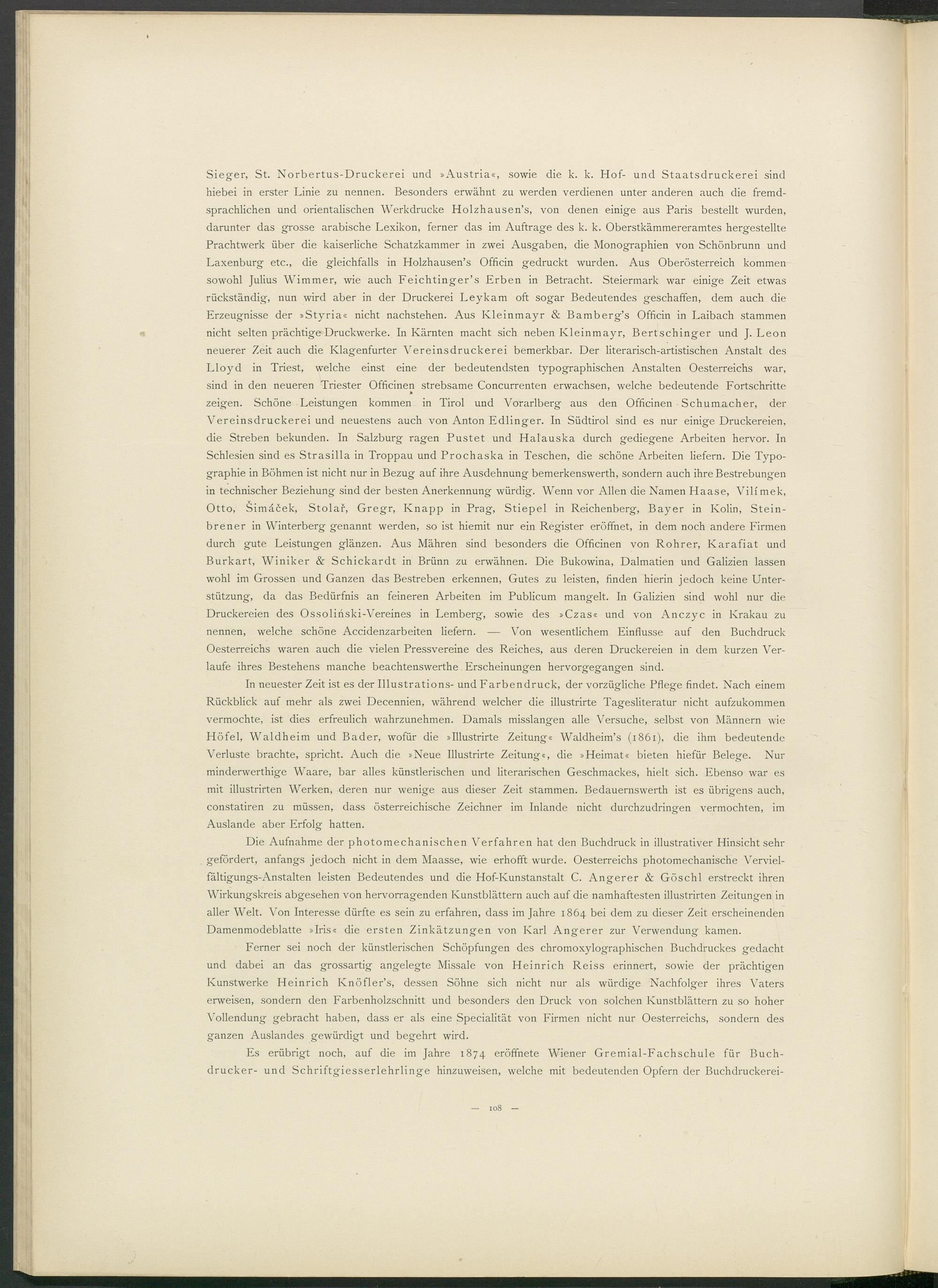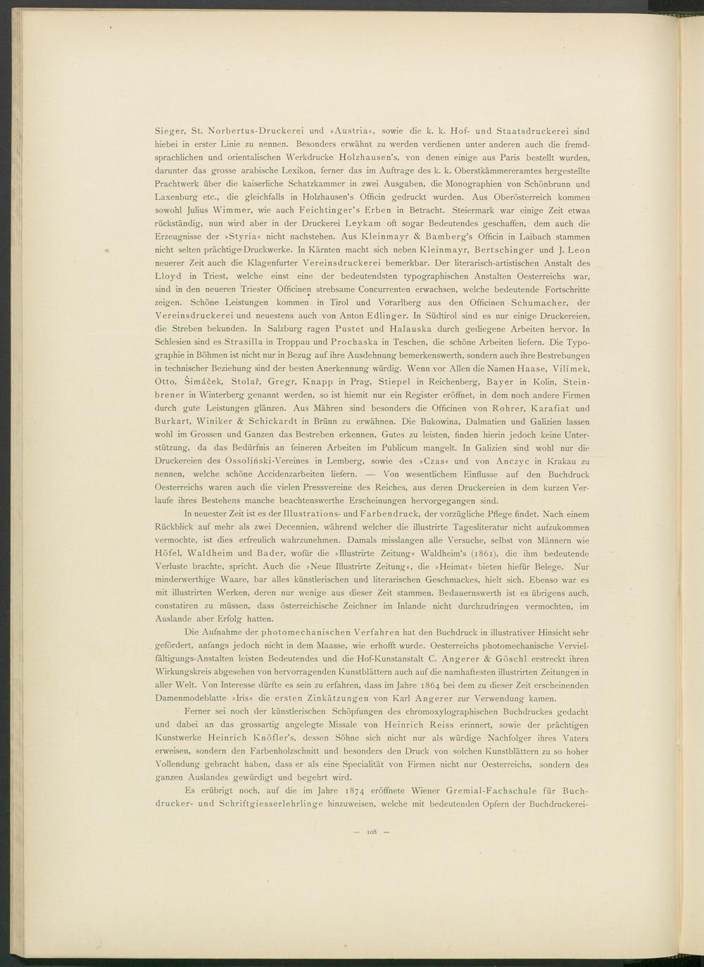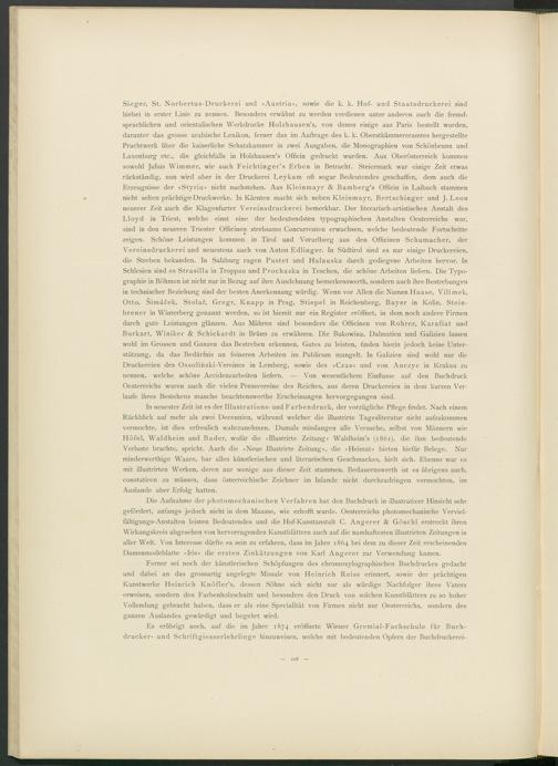 Sieger, St. Norbertus-Druckerei und »Austria«, sowie die k. k. Hof- und Staatsdruckerei sind hiebei in erster Linie zu nennen. Besonders erwähnt zu werden verdienen unter anderen auch die fremdsprachlichen und orientalischen Werkdrucke Holzhausen’s, von denen einige aus Paris bestellt wurden, darunter das grosse arabische Lexikon, ferner das im Aufträge des k. k. Oberstkämmereramtes hergestellte Prachtwerk über die kaiserliche Schatzkammer in zwei Ausgaben, die Monographien von Schönbrunn und Laxenburg etc., die gleichfalls in Holzhausen’s Officin gedruckt wurden. Aus Oberösterreich kommen sowohl Julius Wimmer, wie auch Feichtinger’s Erben in Betracht. Steiermark war einige Zeit etwas rückständig, nun wird aber in der Druckerei Leykam oft sogar Bedeutendes geschaffen, dem auch die Erzeugnisse der »Styria« nicht nachstehen. Aus Ivleinmayr & Bamberg’s Officin in Laibach stammen nicht selten prächtige Druckwerke. In Kärnten macht sich neben Ivleinmayr, Bertschinger und J. Leon neuerer Zeit auch die Klagenfurter Vereinsdruckerei bemerkbar. Der literarisch-artistischen Anstalt des Lloyd in Triest, welche einst eine der bedeutendsten typographischen Anstalten Oesterreichs war, sind in den neueren Triester Officinen strebsame Concurrenten erwachsen, welche bedeutende Fortschritte zeigen. Schöne Leistungen kommen in Tirol und Vorarlberg aus den Officinen Schumacher, der Vereinsdruckerei und neuestens auch von Anton Edlinger. In Südtirol sind es nur einige Druckereien, die Streben bekunden. In Salzburg ragen Pustet und Halauska durch gediegene Arbeiten hervor. In Schlesien sind es Strasilla in Troppau und Prochaska in Teschen, die schöne Arbeiten liefern. Die Typographie in Böhmen ist nicht nur in Bezug auf ihre Ausdehnung bemerkenswerth, sondern auch ihre Bestrebungen in technischer Beziehung sind der besten Anerkennung würdig. Wenn vor Allen die Namen Haase, Vilimek, Otto, Simäcek, Stolar, Gregr, Knapp in Prag, Stiepel in Reichenberg, Bayer in Ivolin, Stein- brener in Winterberg genannt werden, so ist hiemit nur ein Register eröffnet, in dem noch andere Firmen durch gute Leistungen glänzen. Aus Mähren sind besonders die Officinen von Rohrer, Karafiat und Burkart, Winiker & Schickardt in Brünn zu erwähnen. Die Bukowina, Dalmatien und Galizien lassen wohl im Grossen und Ganzen das Bestreben erkennen, Gutes zu leisten, finden hierin jedoch keine Unterstützung, da das Bedürfnis an feineren Arbeiten im Publicum mangelt. In Galizien sind wohl nur die Druckereien des Ossolinski-Vereines in Lemberg, sowie des »Czas« und von Anczyc in Krakau zu nennen, welche schöne Accidenzarbeiten liefern. — Von wesentlichem Einflüsse auf den Buchdruck Oesterreichs waren auch die vielen Pressvereine des Reiches, aus deren Druckereien in dem kurzen Verlaufe ihres Bestehens manche beachtenswerthe Erscheinungen hervorgegangen sind.