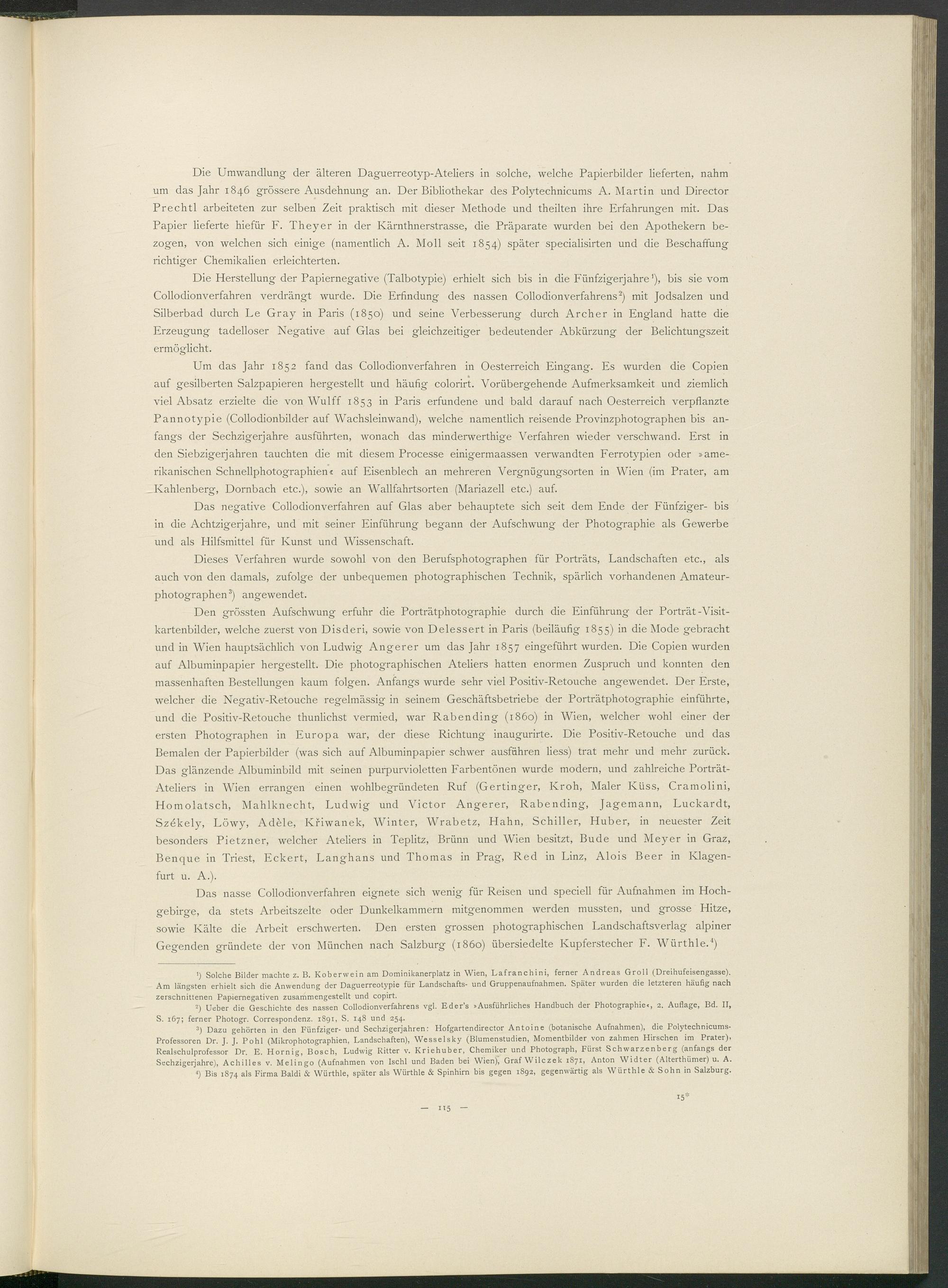 3 ) Dazu gehörten in den Fünfziger- und Sechzigerjahren: Hofgartendirector Antoine (botanische Aufnahmen), die Polytechnicums- Professoren Dr. J. J. Pohl (Mikrophotographien, Landschaften), Wesselsky (Blumenstudien, Momentbilder von zahmen Hirschen im Prater), Realschulprofessor Dr. E. Hornig, Bosch, Ludwig Ritter v. Kriehuber, Chemiker und Photograph, Fürst Schwarzenberg (anfangs der Sechzigerjahre), Achilles v. Melingo (Aufnahmen von Ischl und Baden bei Wien), Graf Wilczek 1871, Anton Widter (Alterthümer) u. A.