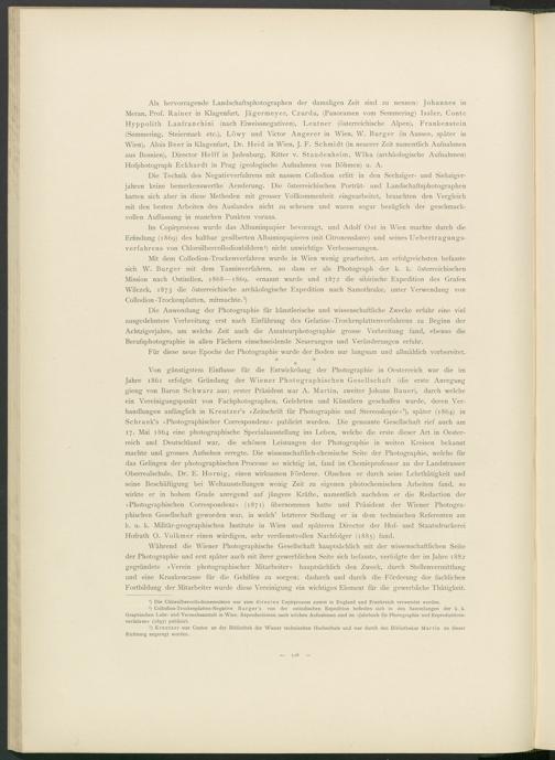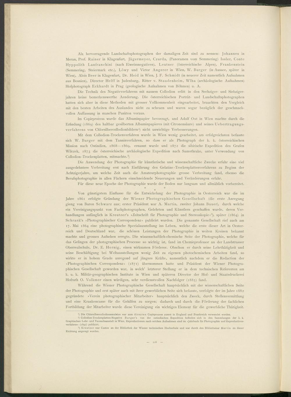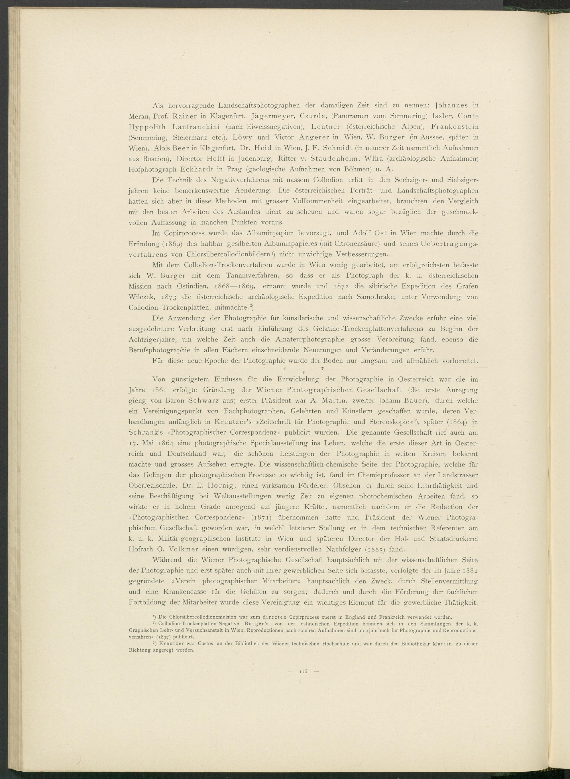 Von günstigstem Einflüsse für die Entwickelung der Photographie in Oesterreich war die im Jahre 1861 erfolgte Gründung der Wiener Photographischen Gesellschaft (die erste Anregung gieng von Baron Schwarz aus; erster Präsident war A. Martin, zweiter Johann Bauer), durch welche ein Vereinigungspunkt von Fachphotographen, Gelehrten und Künstlern geschaffen wurde, deren Verhandlungen anfänglich in Kreutzer’s »Zeitschrift für Photographie und Stereoskopie« 3 ), später (1864) in Schrank’s »Photographischer Correspondenz« publicirt wurden. Die genannte Gesellschaft rief auch am 17. Mai 1864 eine photographische Specialausstellung ins Leben, welche die erste dieser Art in Oesterreich und Deutschland war, die schönen Leistungen der Photographie in weiten Kreisen bekannt machte und grosses Aufsehen erregte. Die wissenschaftlich-chemische Seite der Photographie, welche für das Gelingen der photographischen Processe so wichtig ist, fand im Chemieprofessor an der Landstrasser Oberrealschule, Dr. E. Hornig, einen wirksamen Förderer. Obschon er durch seine Lehrthätigkeit und seine Beschäftigung bei Weltausstellungen wenig Zeit zu eigenen photochemischen Arbeiten fand, so wirkte er in hohem Grade anregend auf jüngere Kräfte, namentlich nachdem er die Redaction der »Photographischen Correspondenz« (1871) übernommen hatte und Präsident der Wiener Photographischen Gesellschaft geworden war, in welch’ letzterer Stellung er in dem technischen Referenten am k. u. k. Militär-geographischen Institute in Wien und späteren Director der Hof- und Staatsdruckerei Hofrath O. Volkmer einen würdigen, sehr verdienstvollen Nachfolger (1885) fand.