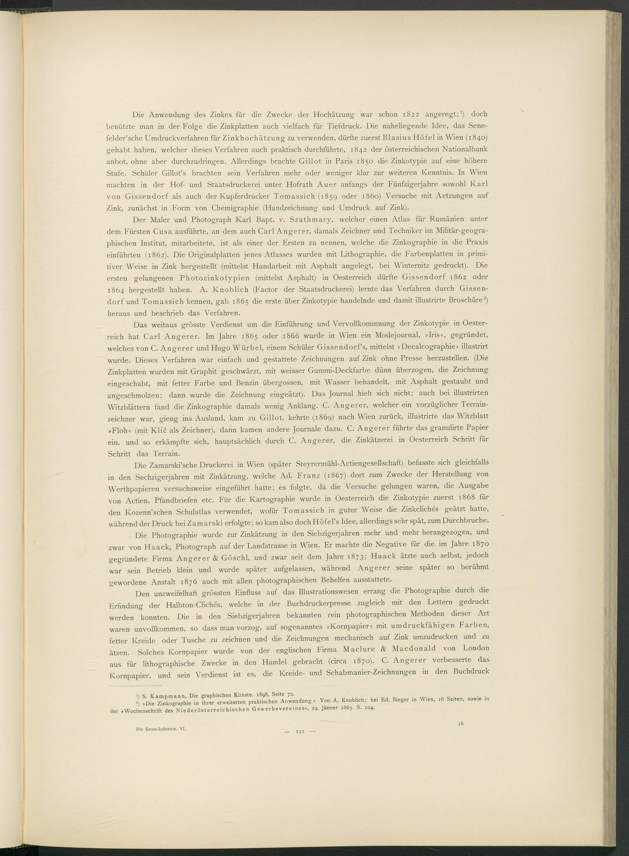 Der Maler und Photograph Karl Bapt. v. Szathmary, welcher einen Atlas für Rumänien unter dem Fürsten Cusa ausführte, an dem auch Carl Angerer, damals Zeichner und Techniker im Militär-geographischen Institut, mitarbeitete, ist als einer der Ersten zu nennen, welche die Zinkographie in die Praxis einführten (1862). Die Originalplatten jenes Atlasses wurden mit Lithographie, die Farbenplatten in primitiver Weise in Zink hergestellt (mittelst Handarbeit mit Asphalt angelegt, bei Winternitz gedruckt). Die ersten gelungenen Photozinkotypien (mittelst Asphalt) in Oesterreich dürfte Gissendorf 1862 oder 1864 hergestellt haben. A. Knoblich (Factor der Staatsdruckerei) lernte das Verfahren durch Gissendorf und Tomassich kennen, gab 1865 die erste über Zinkotypie handelnde und damit illustrirte Broschüre 2 ) heraus und beschrieb das Verfahren.