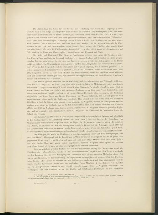 Die Anwendung des Zinkes für die Zwecke der Hochätzung war schon 1822 angeregt;') doch benützte man in der Folge die Zinkplatten auch vielfach für Tiefdruck. Die naheliegende Idee, das Sene- felder’sche Um druck verfahren für Zinkhochätzung zu verwenden, dürfte zuerst Blasius Höfel in Wien (1840) gehabt haben, welcher dieses Verfahren auch praktisch durchführte, 1842 der österreichischen Nationalbank anbot, ohne aber durchzudringen. Allerdings brachte Gillot in Paris 1850 die Zinkotypie auf eine höhere Stufe. Schüler Gillot’s brachten sein Verfahren mehr oder weniger klar zur weiteren Kenntnis. In Wien machten in der Hof- und Staatsdruckerei unter Hofrath Auer anfangs der Fünfzigerjahre sowohl Karl von Gissendorf als auch der Kupferdrucker Tomassich (1859 oder 1860) Versuche mit Aetzungen auf Zink, zunächst in Form von Chemigraphie (Handzeichnung und Umdruck auf Zink).