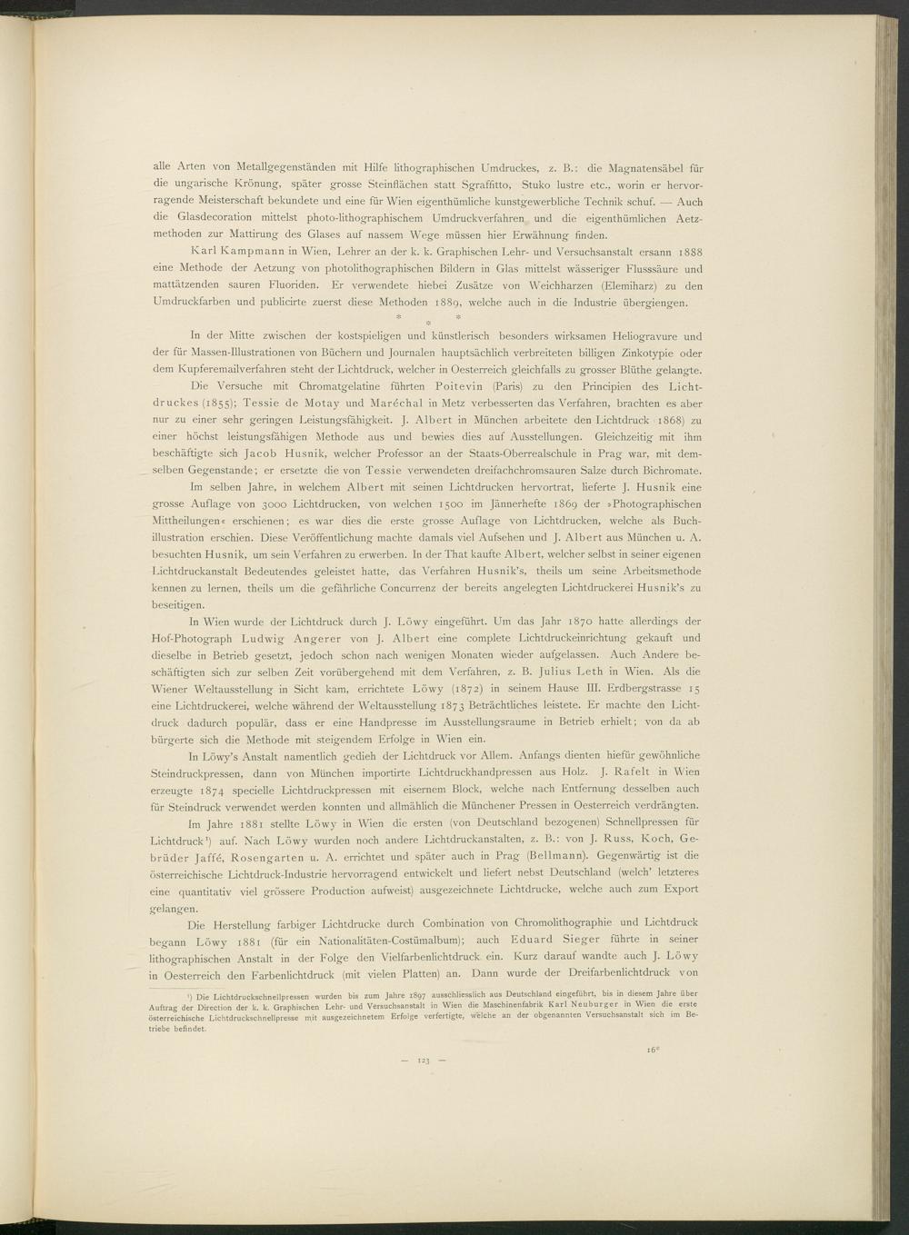 Im Jahre 1881 stellte Löwy in Wien die ersten (von Deutschland bezogenen) Schnellpressen für Lichtdruck 1 ) auf. Nach Löwy wurden noch andere Lichtdruckanstalten, z. B.: von J. Russ, Koch, Gebrüder Jaffé, Rosengarten u. A. errichtet und später auch in Prag (Bellmann). Gegenwärtig ist die österreichische Lichtdruck-Industrie hervorragend entwickelt und liefert nebst Deutschland (welch’ letzteres eine quantitativ viel grössere Production aufweist) ausgezeichnete Lichtdrucke, welche auch zum Export gelangen.