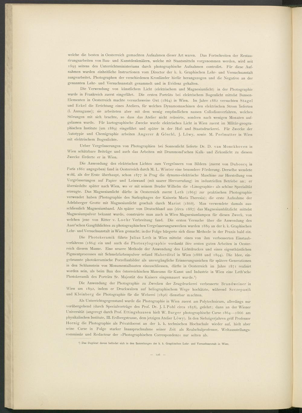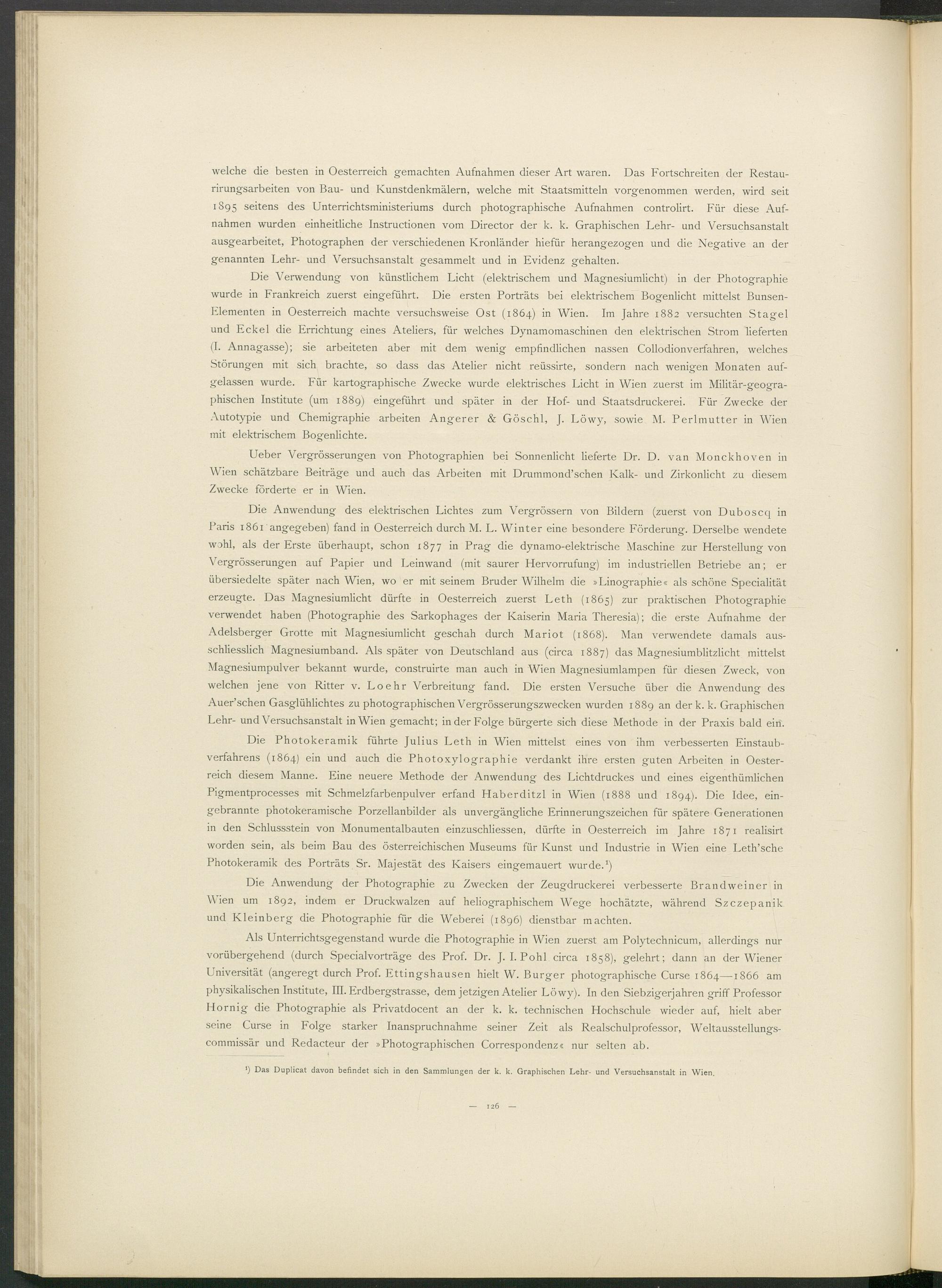 Die Anwendung des elektrischen Lichtes zum Vergrössern von Bildern (zuerst von Duboscq in Paris 1861 angegeben) fand in Oesterreich durch M. L. Winter eine besondere Förderung. Derselbe wendete wohl, als der Erste überhaupt, schon 1877 in Prag die dynamo-elektrische Maschine zur Herstellung von Vergrösserungen auf Papier und Leinwand (mit saurer Hervorrufung) im industriellen Betriebe an; er übersiedelte später nach Wien, wo er mit seinem Bruder Wilhelm die »Linographie« als schöne Specialität erzeugte. Das Magnesiumlicht dürfte in Oesterreich zuerst Leth (1865) zur praktischen Photographie verwendet haben (Photographie des Sarkophages der Kaiserin Maria Theresia); die erste Aufnahme der Adelsberger Grotte mit Magnesiumlicht geschah durch Mariot (1868). Man verwendete damals ausschliesslich Magnesiumband. Als später von Deutschland aus (circa 1887) das Magnesiumblitzlicht mittelst Magnesiumpulver bekannt wurde, construirte man auch in Wien Magnesiumlampen für diesen Zweck, von welchen jene von Ritter v. Loehr Verbreitung fand. Die ersten Versuche über die Anwendung des Auer’schen Gasglühlichtes zu photographischen Vergrösserungszwecken wurden 1889 an der k. k. Graphischen Lehr- und Versuchsanstalt in Wien gemacht; in der Folge bürgerte sich diese Methode in der Praxis bald ein.