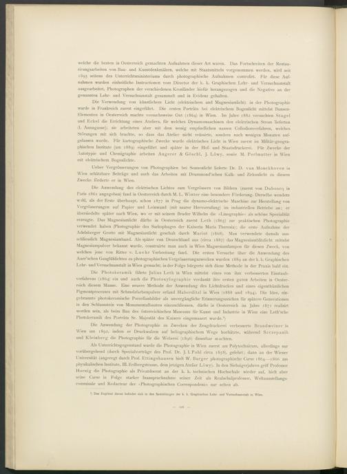 Als Unterrichtsgegenstand wurde die Photographie in Wien zuerst am Polytechnicum, allerdings nur vorübergehend (durch Specialvorträge des Prof. Dr. J. I. Pohl circa 1858), gelehrt; dann an der Wiener Universität (angeregt durch Prof. Ettingshausen hielt W. Burger photographische Curse 1864—1866 am physikalischen Institute, III. Erdbergstrasse, dem jetzigen Atelier Löwy). In den Siebzigerjahren griff Professor Hornig die Photographie als Privatdocent an der k. k. technischen Hochschule wieder auf, hielt aber seine Curse in Folge starker Inanspruchnahme seiner Zeit als Realschulprofessor, Weltausstellungs- commissär und Redacteur der »Photographischen Correspondenz« nur selten ab.